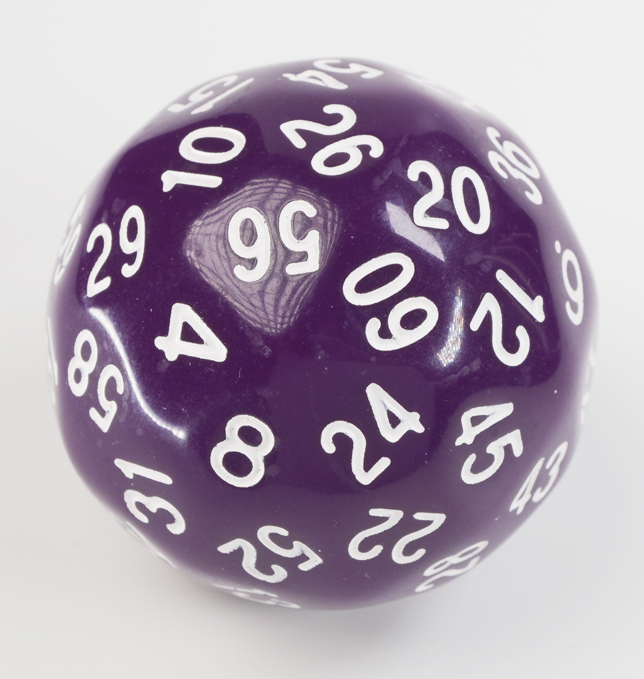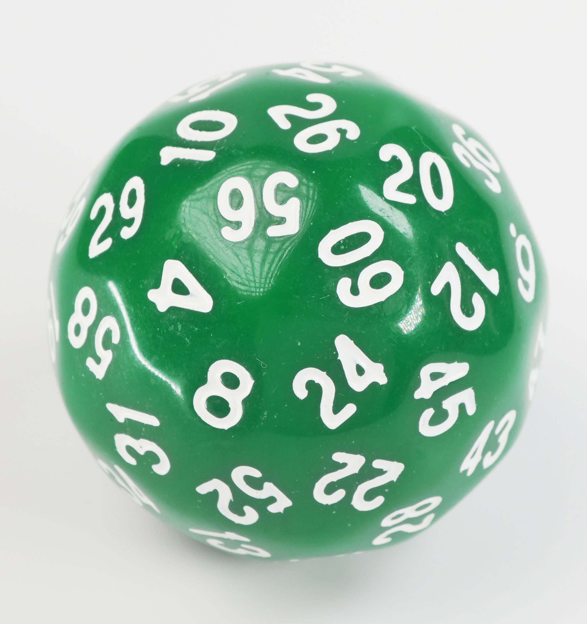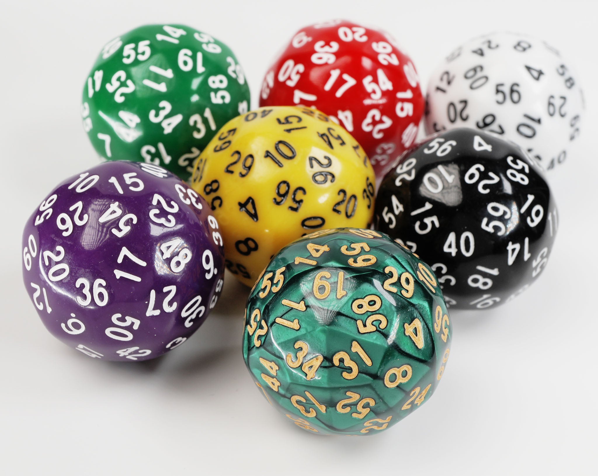The Dice Lab designs dice to be as fair as possible using both physical and numerical balancing. The d60 is now available in your choice of 7 different colors. Each die will generate a number between 1 and 60.