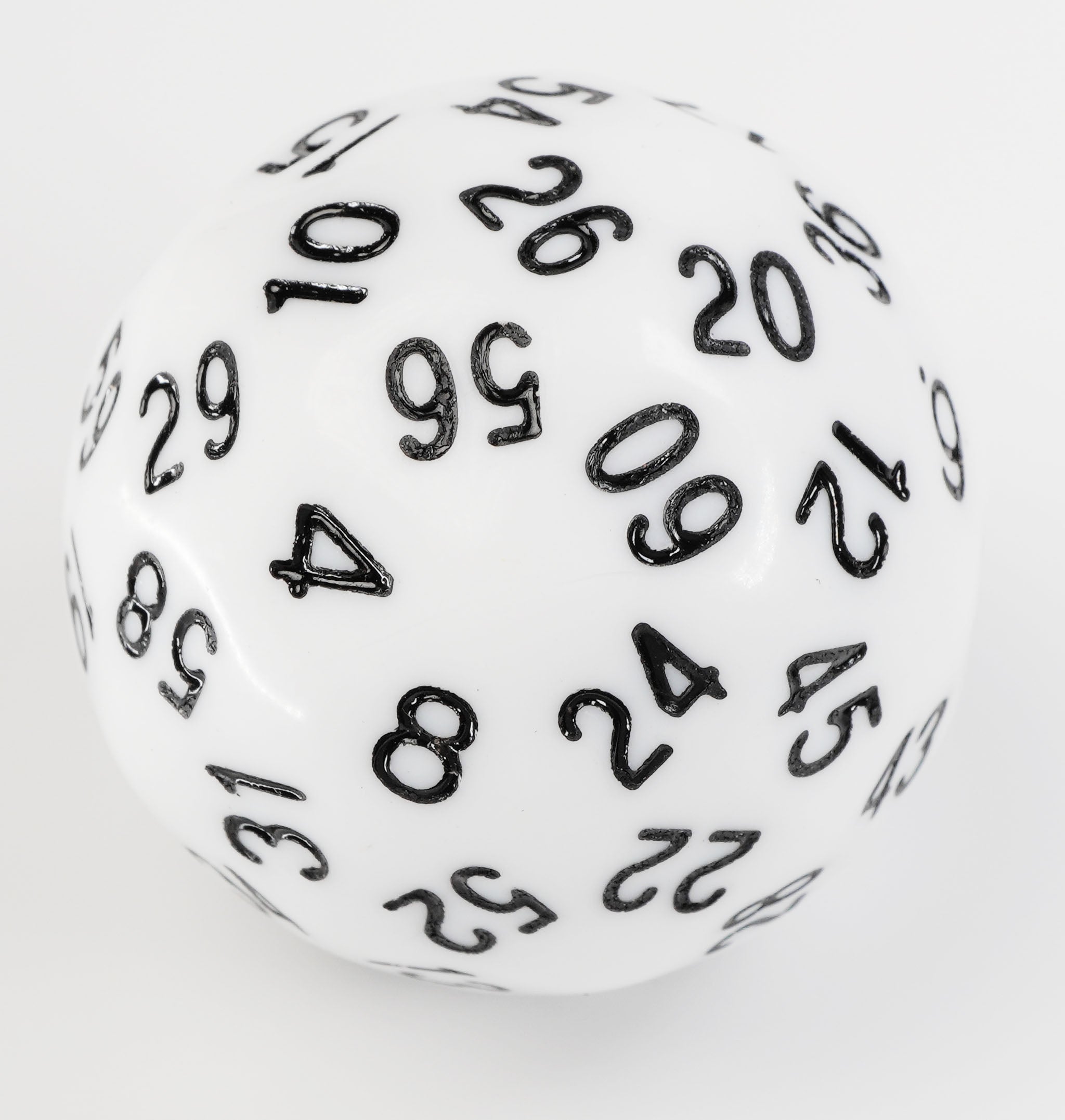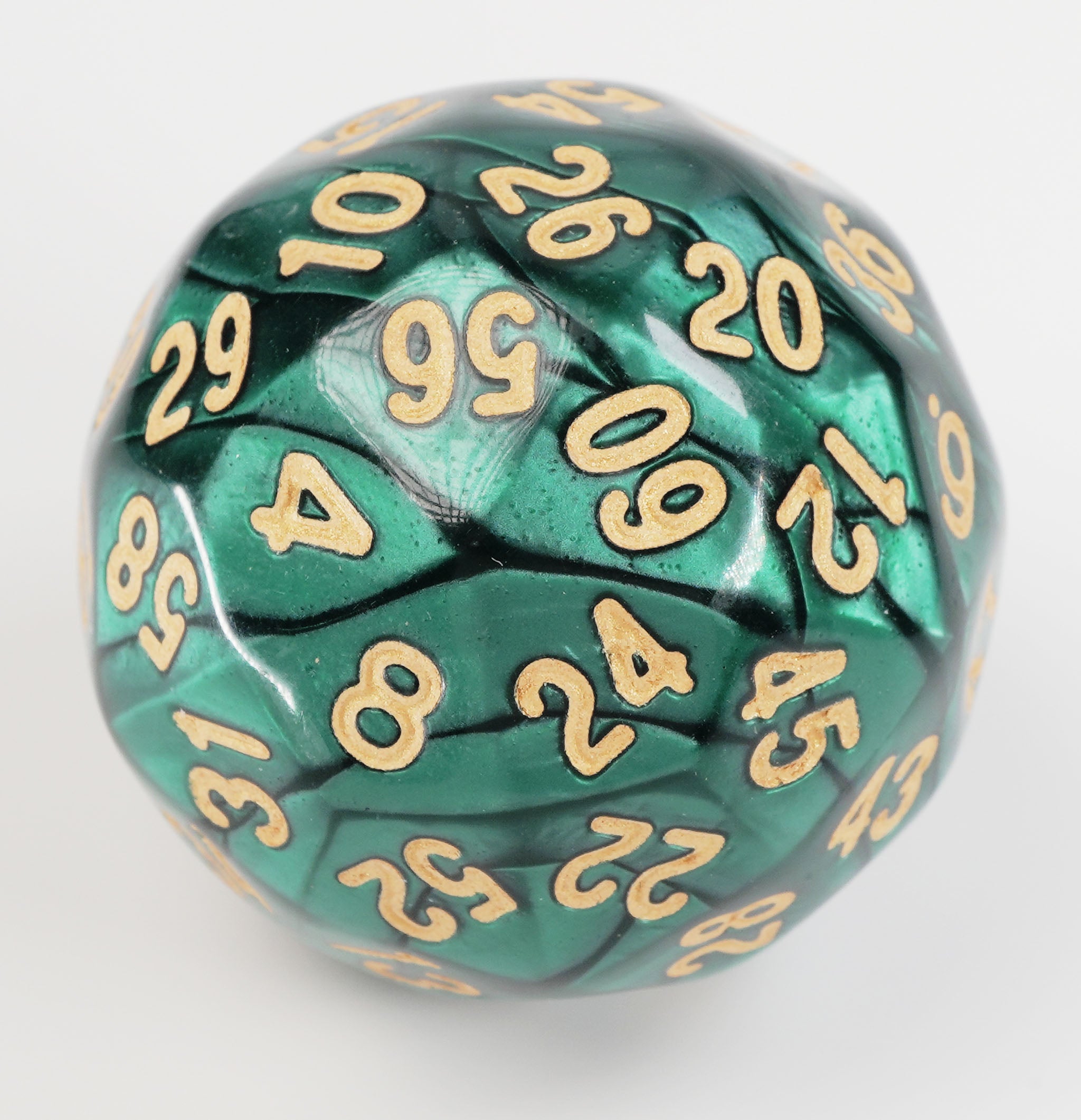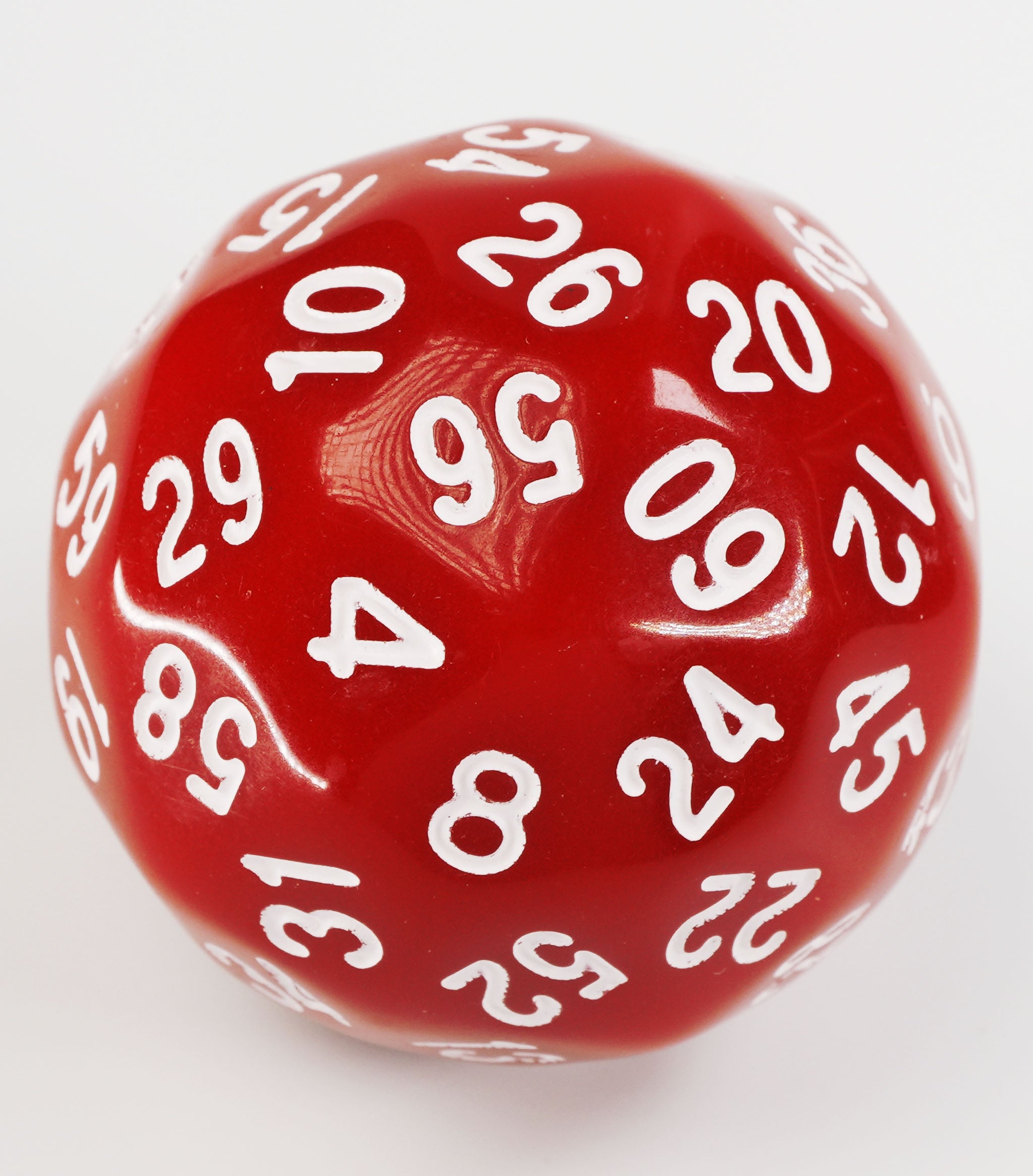 The Dice Lab designs dice to be as fair as possible using both physical and numerical balancing. The d60 is now available in your choice of 7 different colors. Each die will generate a number between 1 and 60.