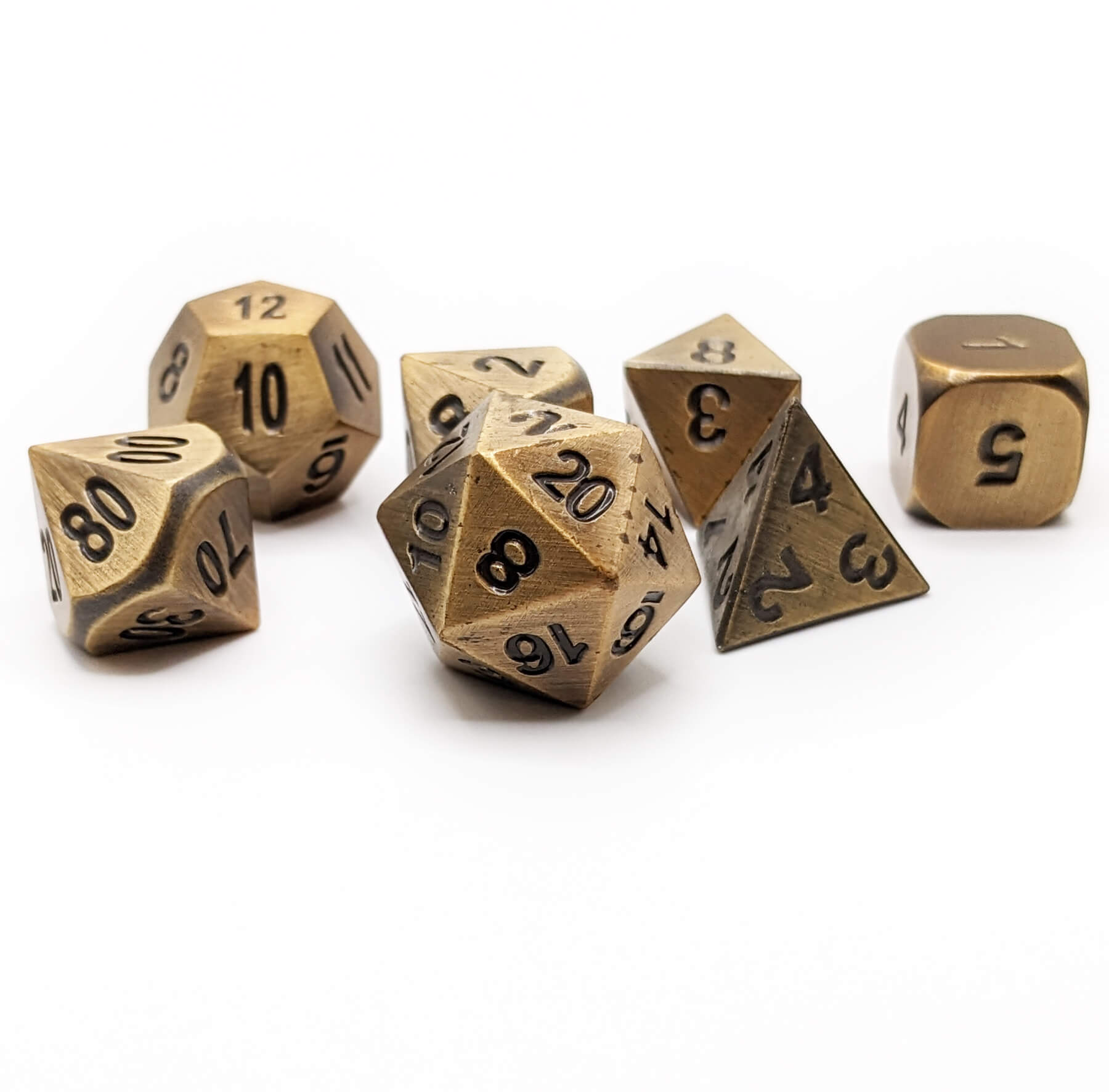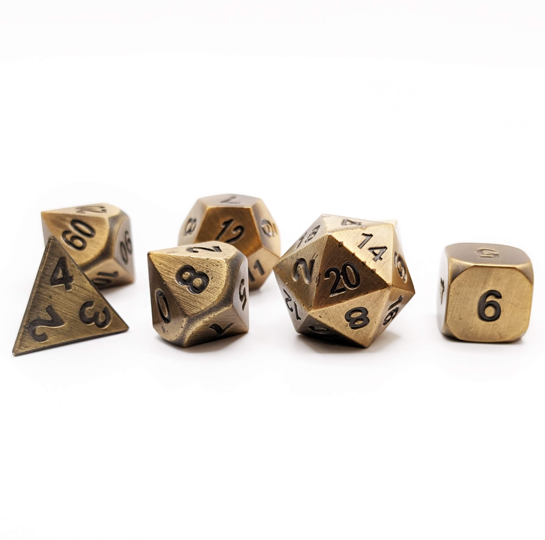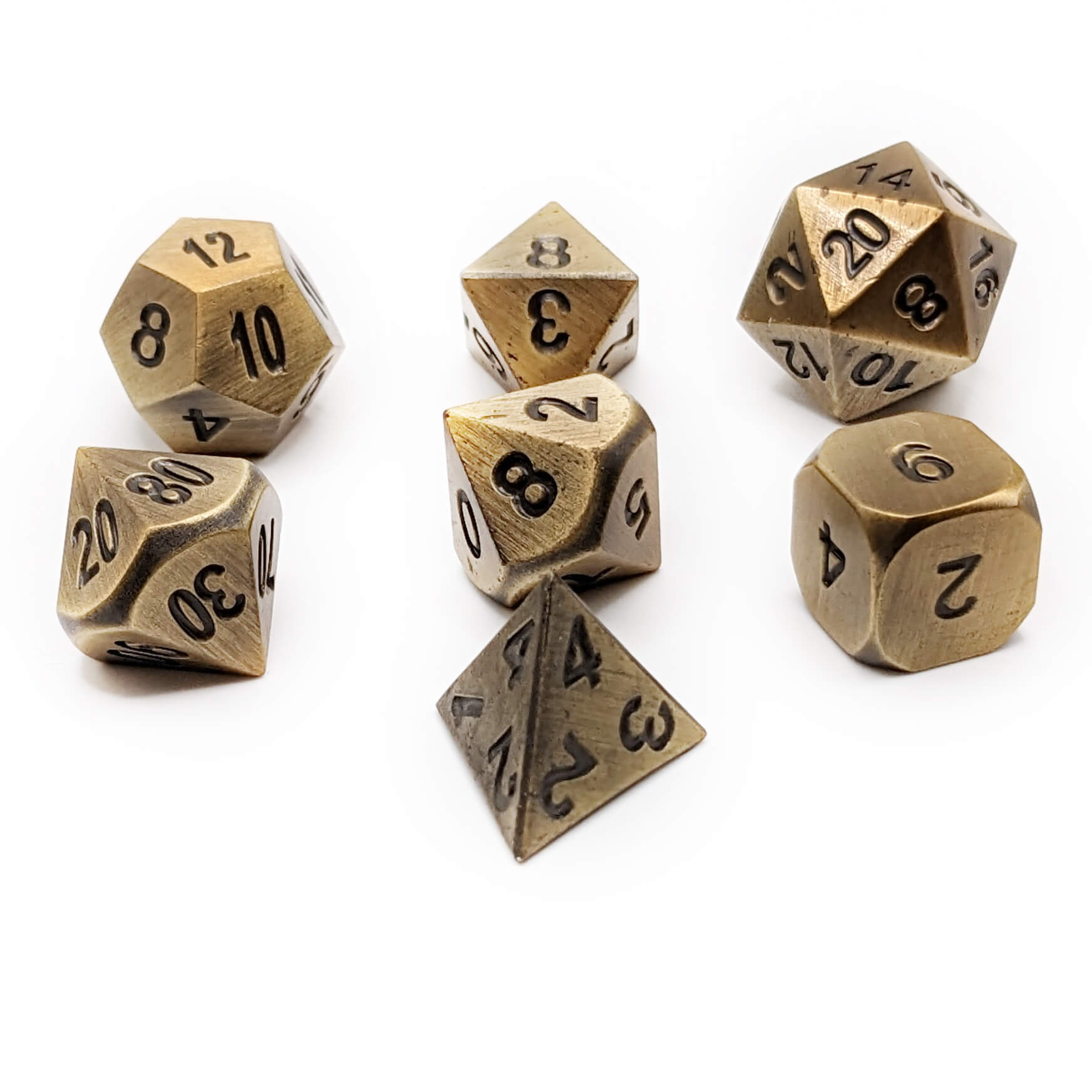 Sturdy dice for the toughest adventures! These rugged dice have a battle hardened gold hue finish with etched numbers. You'll love the irresistible feel of these heavy dice in your hand. Comes complete in a traditional 7-piece polyhedral set: d4, d6, d8, d10, d00, d12 and d20. Amazing dice for Dungeons & Dragons, Pathfinder, and all the best tabletop roleplaying games.