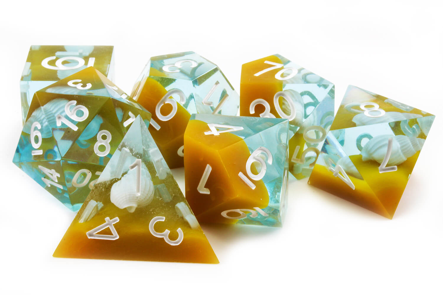 - 7 sharp edge dice with seashell inclusions