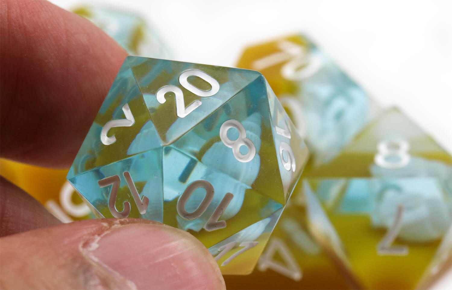 Sharp Edge Inclusion Dice are carefully handcrafted from two tone resin. The Seascape set contains a suspended seashell in a watery blue and sand colored layer. These dice are gorgeous. Gamers will be hard-pressed to find dice more breathtakingly beautiful!