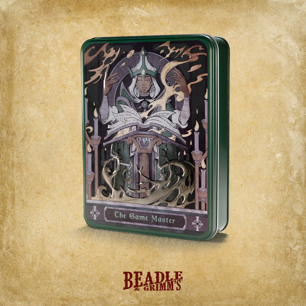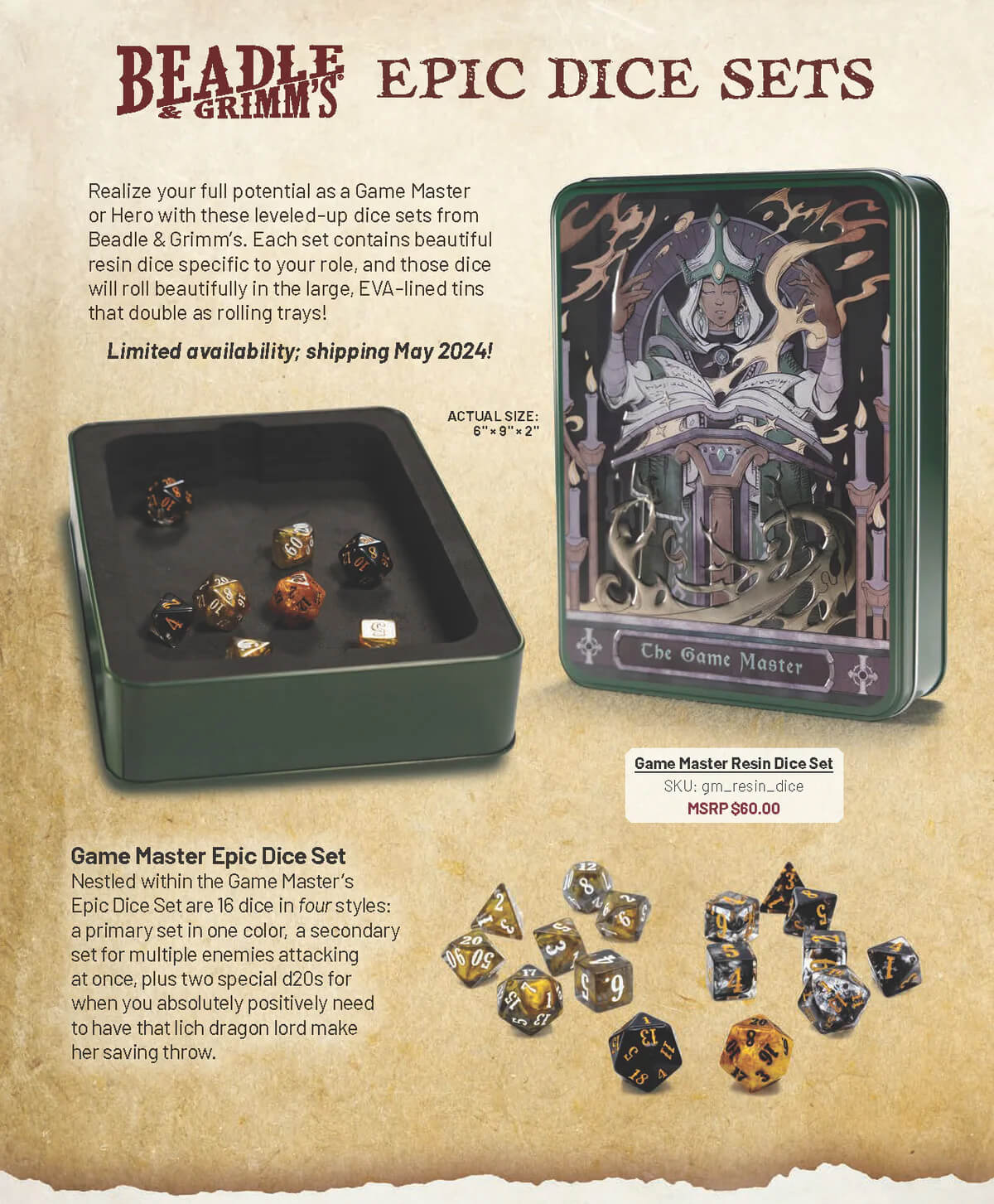 Realize your full potential as a Game Master or Hero with these leveled-up dice sets from Beadle & Grimm’s. Each set contains beautiful resin dice specific to your role, and those dice will roll beautifully in the large, EVA-lined tins that double as rolling trays!