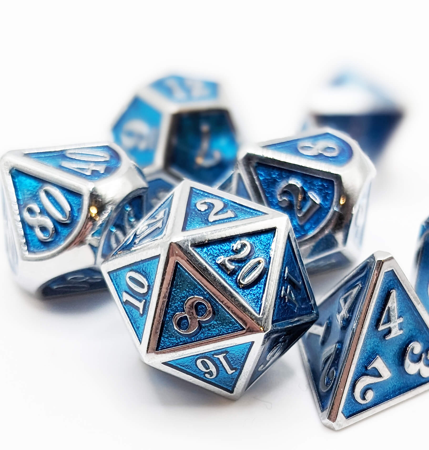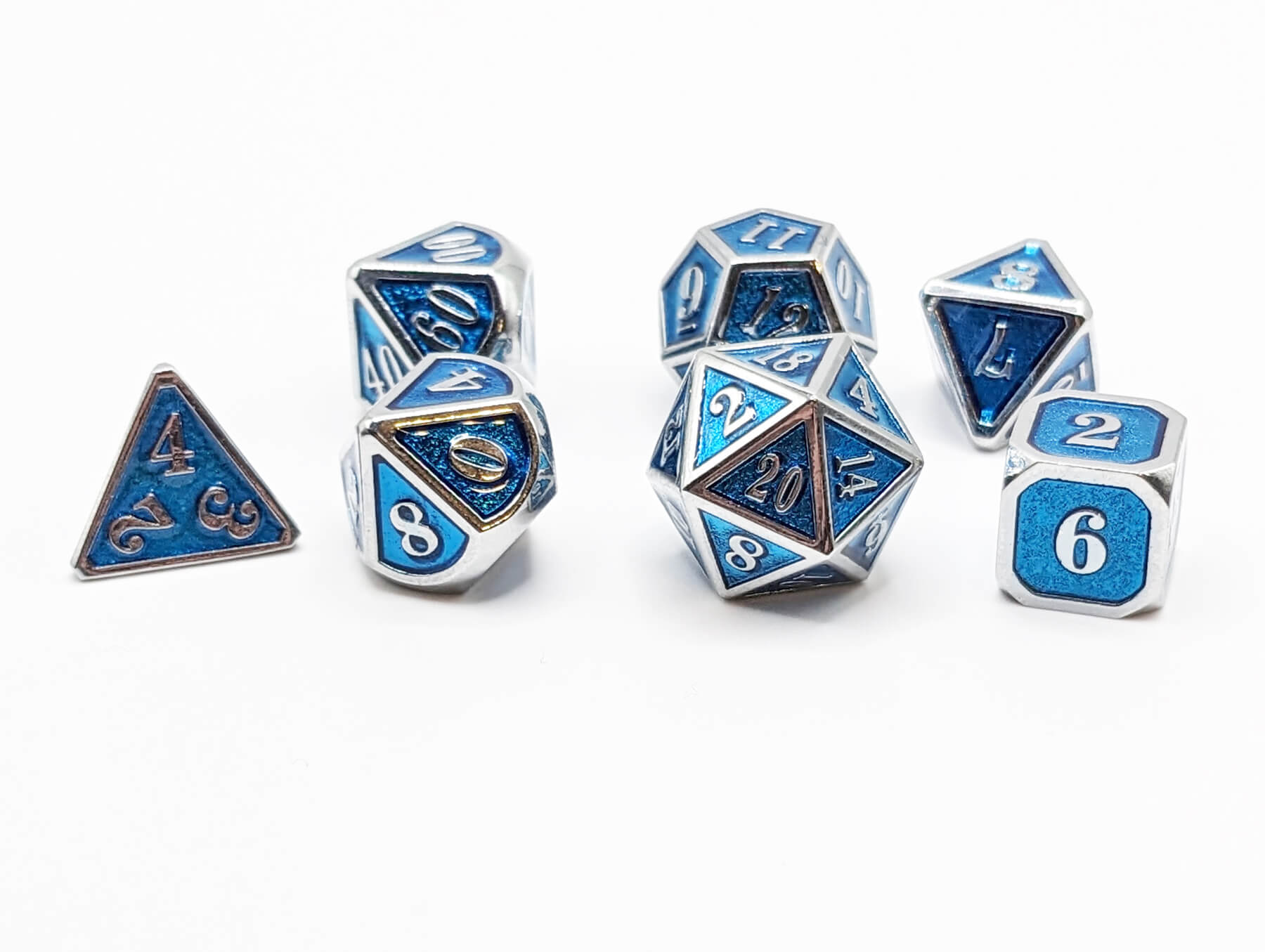Roll in style with a set of premium metal dice. These gorgeous dice have a filled inlay of durable, light blue resin. You'll love the rich, full color and the irresistible feel of these heavy dice in your hand. Comes complete in a traditional 7-piece polyhedral set: d4, d6, d8, d10, d00, d12 and d20. Amazing dice for Dungeons & Dragons, Pathfinder, and all the best tabletop roleplaying games.