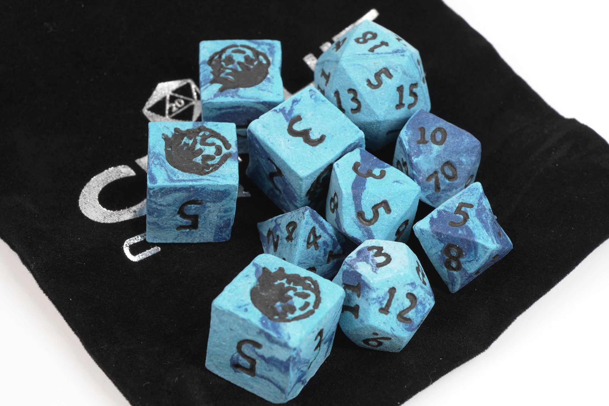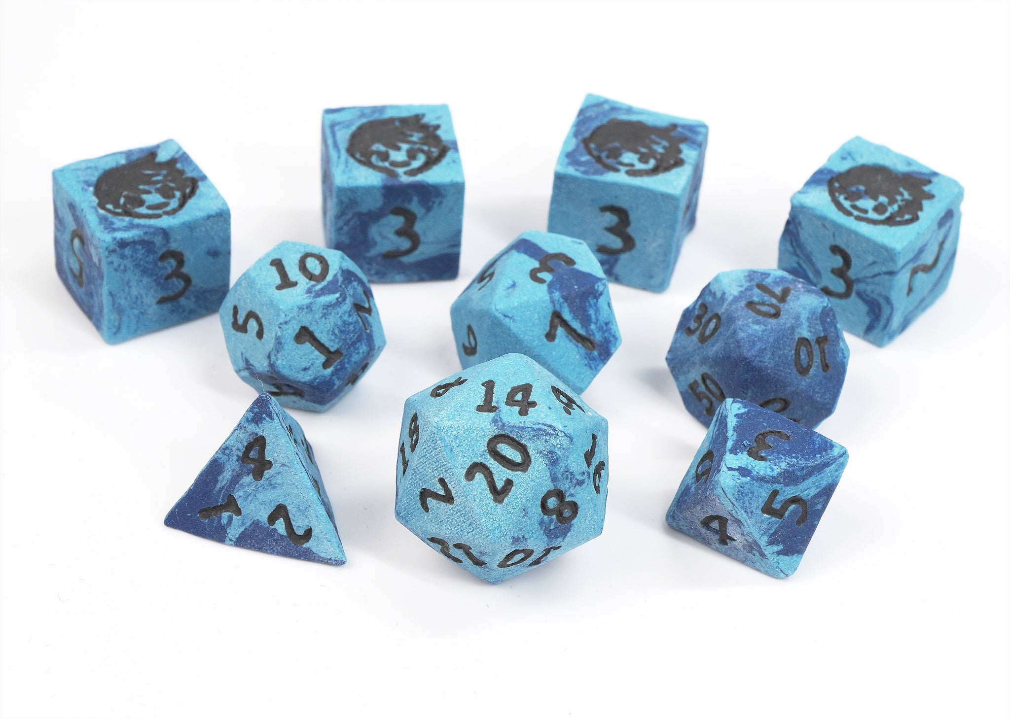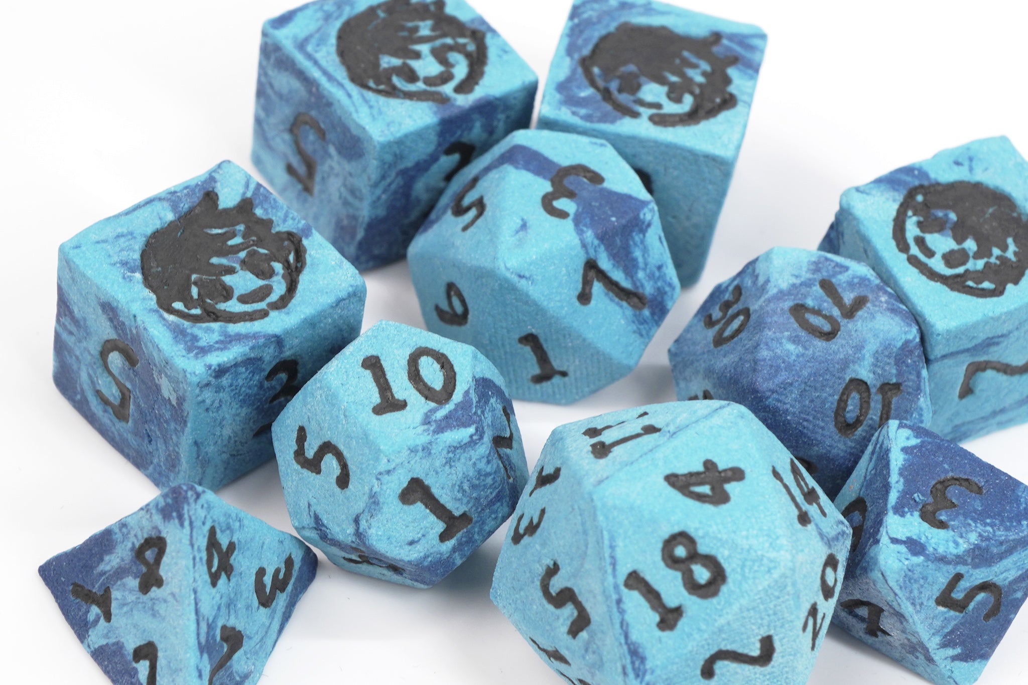 The Dark Elf Dice 20th Anniversary set is an exclusive dark and light blue with black numbers. The face of our iconic Dark Elf Dice mascot replaces the "6" on the sets' six-sided dice. Each die has been pressed and numbered by hand and has been weighed for consistency. To achieve the hardness and durability for your favorite tabletop roleplaying games, the clay has been fired for over 12 hours at an ultra-high temperature.
