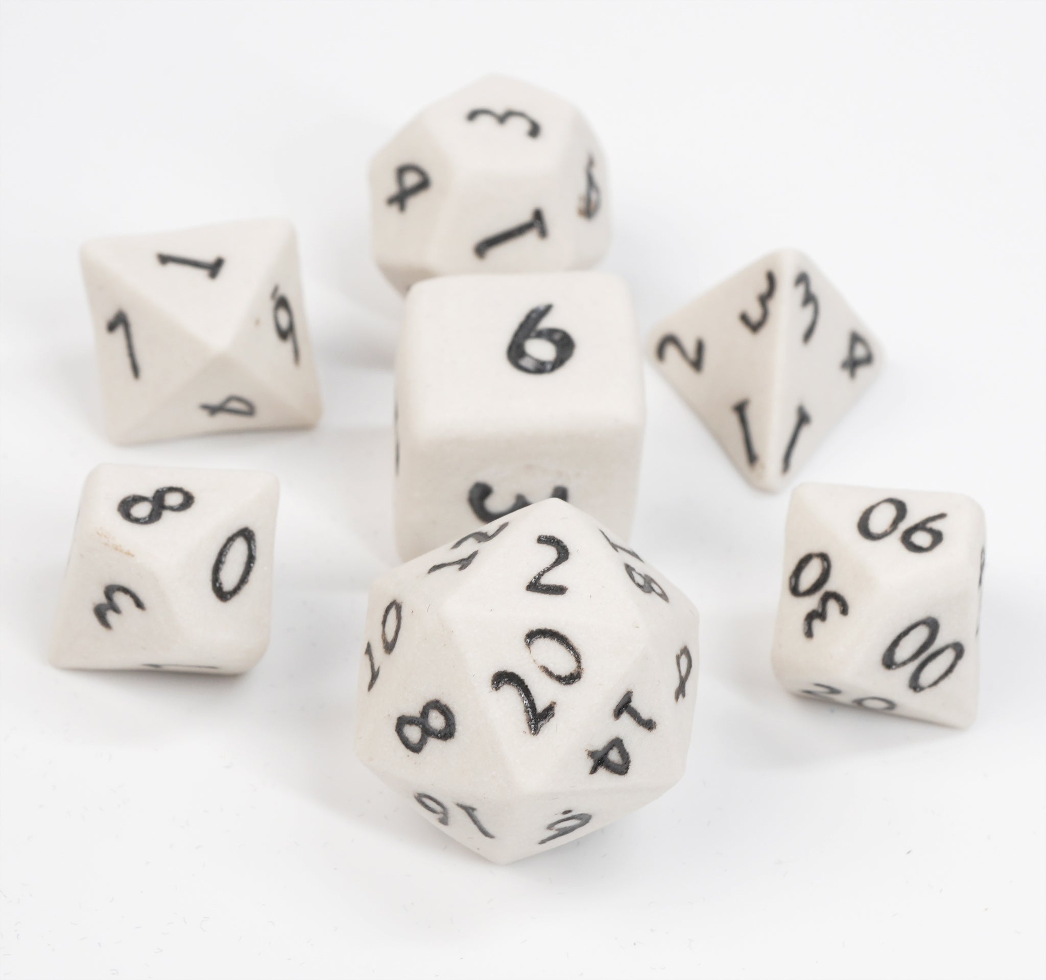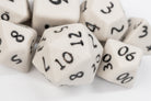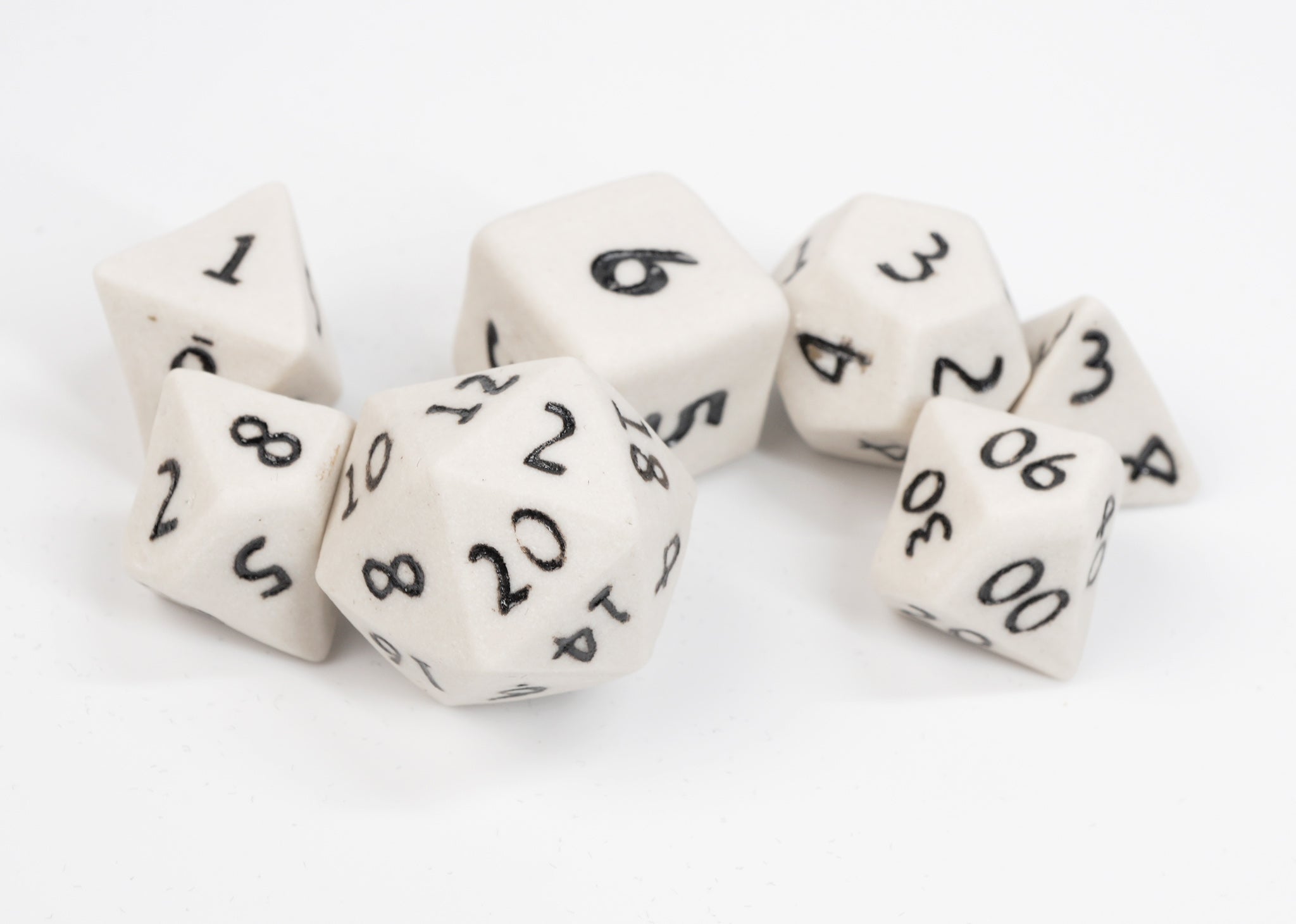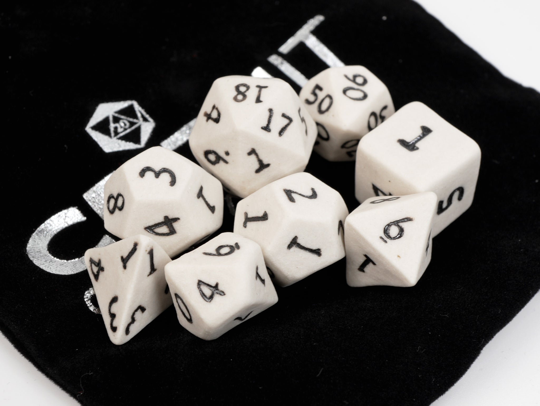 The Skeleton dice set is white with black numbers. Each die has been pressed and numbered by hand and has been weighed for consistency. To achieve the hardness and durability for your favorite tabletop roleplaying games, the clay has been fired for over 12 hours at an ultra-high temperature.