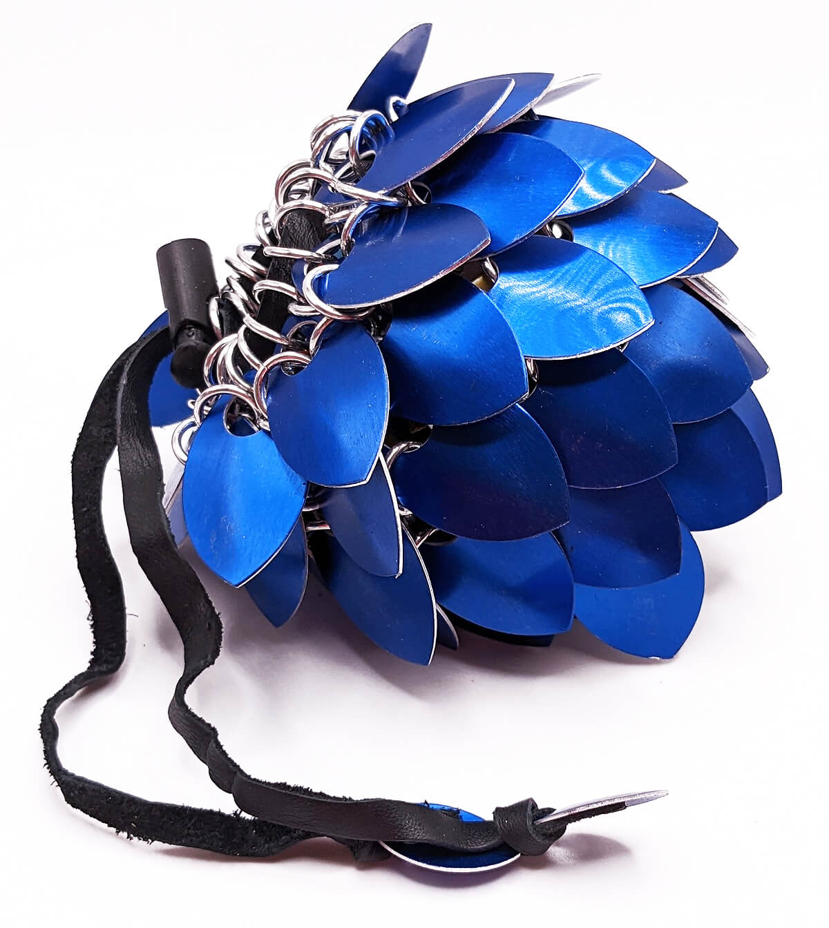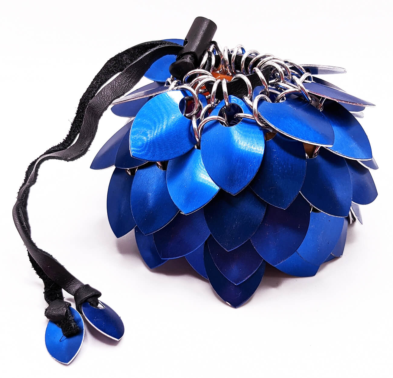 Embrace the power and protect your dice horde like a champion with a Dragon Scale dice bag! Handcrafted from aluminum scales, this bag is light weight, sturdy, and absolutely stunning. Safely store and transport your dice to your next gaming session and look great while doing so. The secure, sliding leather drawstring clasp keeps your dice secure so you won't lose a precious d20 on game night. Doubles as a great cosplay or LARP accessory as well.