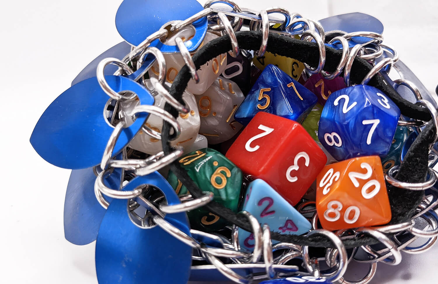 The Chainmail dice bag holds approximately 30-50 standard TTRPG dice. A perfect accessory for Pathfinder, Dungeons & Dragons, and all your favorite role playing games.