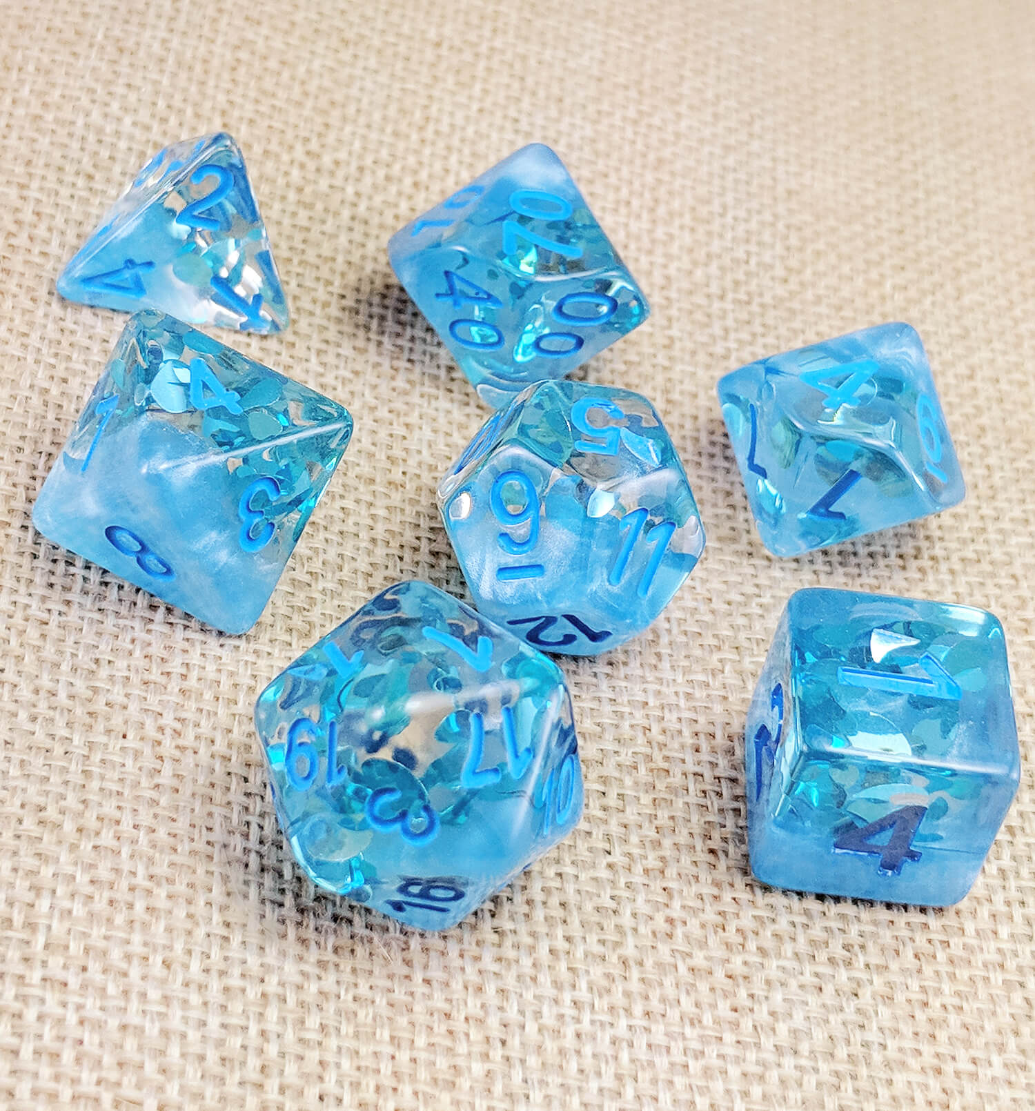 Four Seasons dice are here! Each die is cast in two magical layers (the first layer is a gorgeous pearlized opaque, and the second layer is translucent clear). The translucent layer is filled with blue waves to mark the summer season.