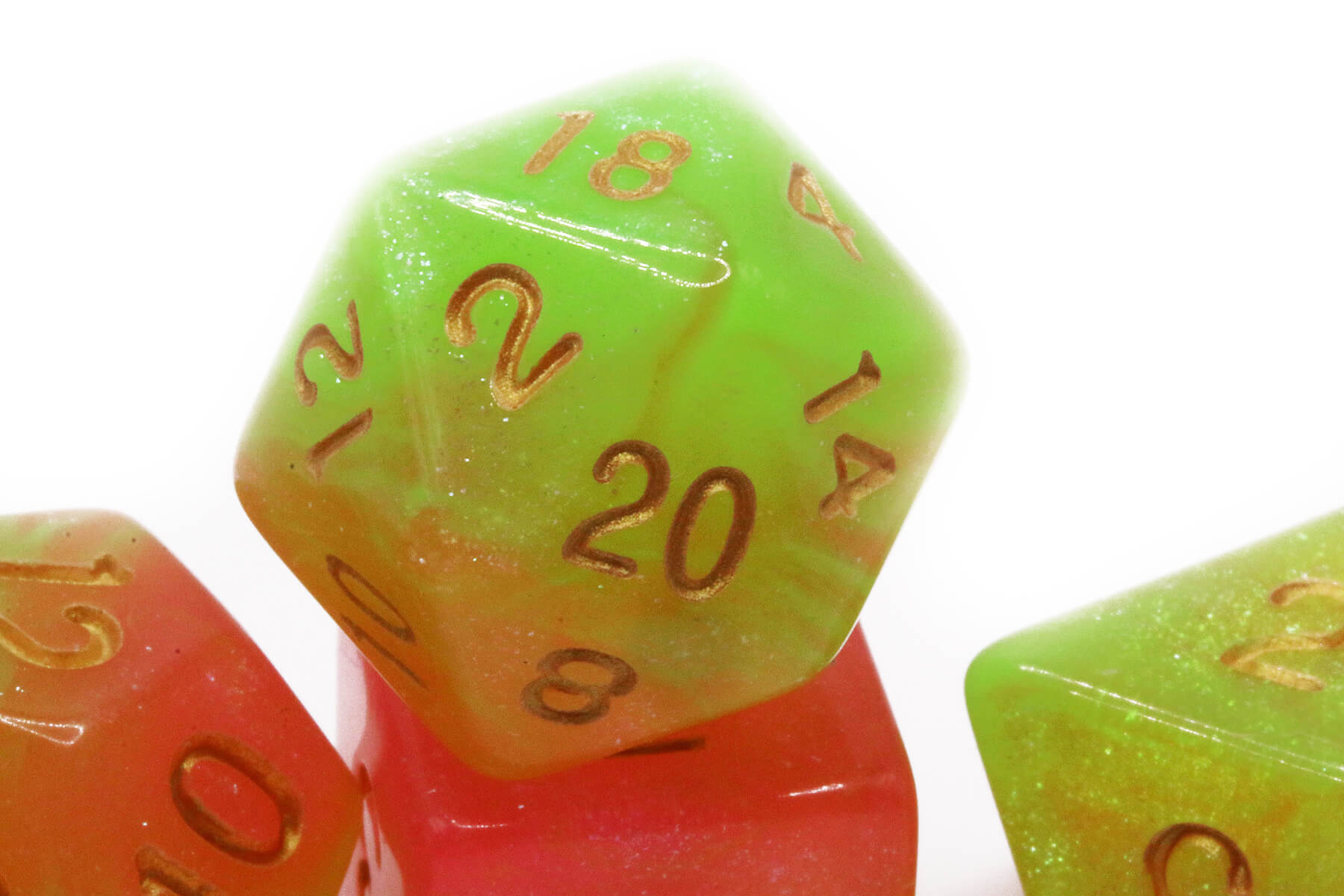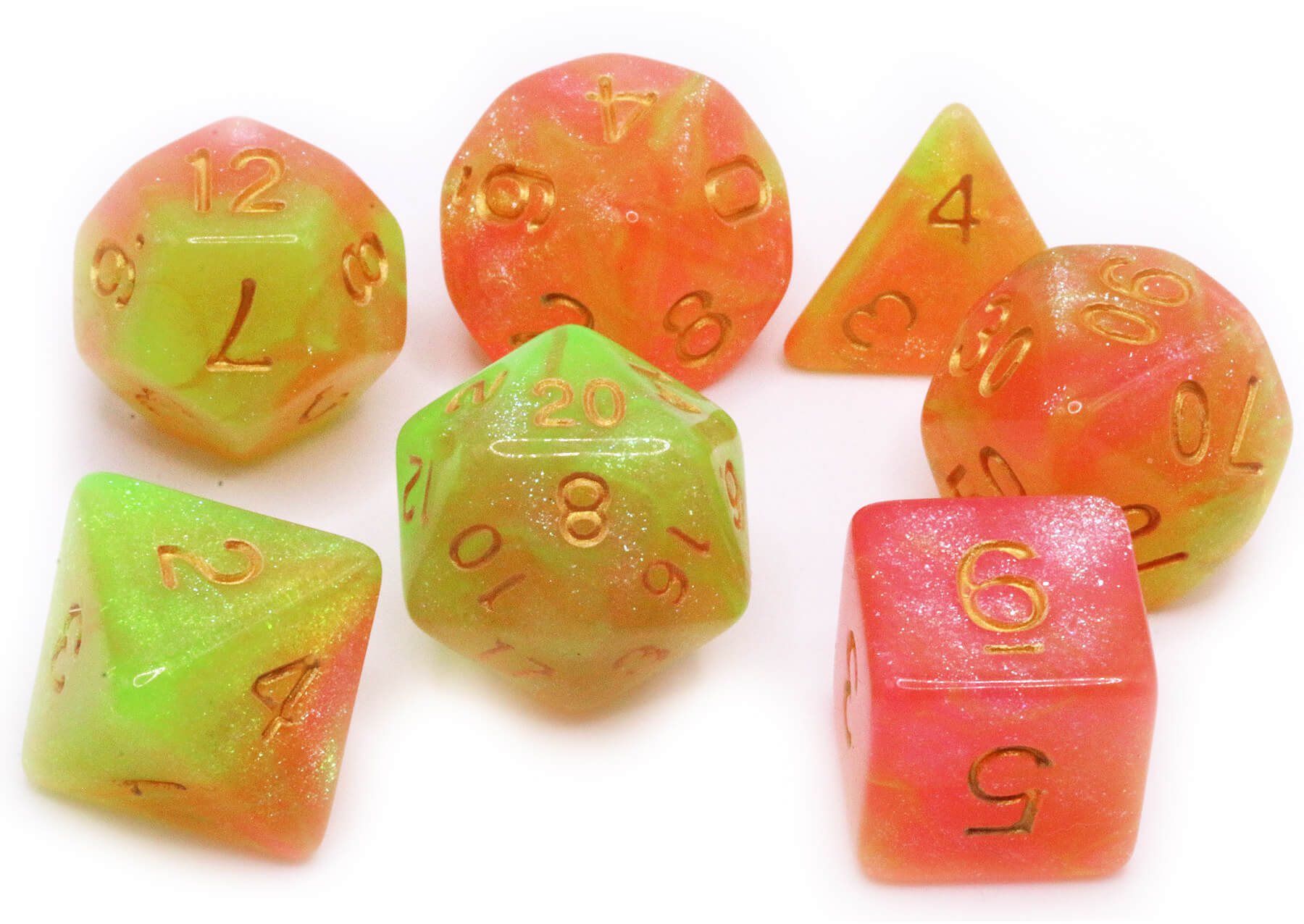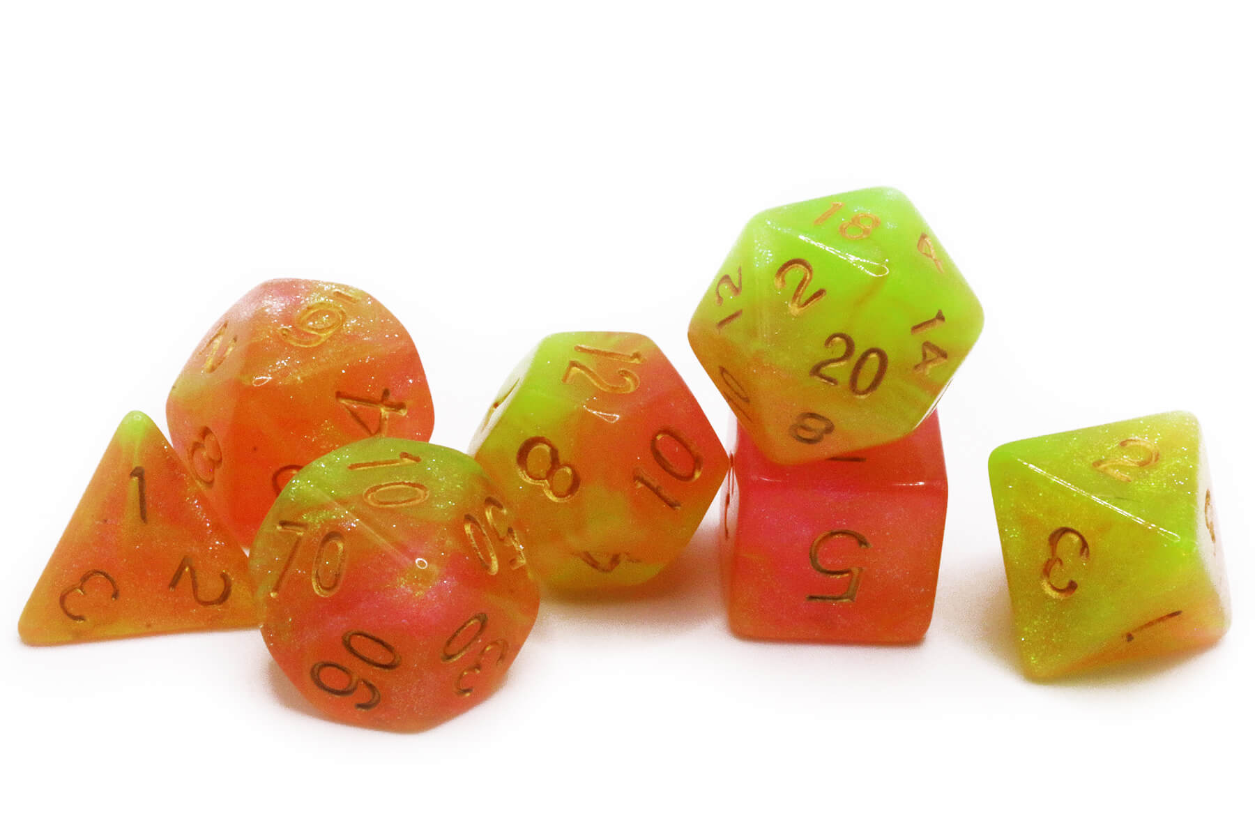 Adventure awaits with Moonfire dice! These affordable dice are made from a blended mix of intense colors that have been glitter bombed with sparkling iridescence. The Radiant Light set is a mesmerizing blend of orange and yellow/green. The easy-to-read numbers are painted in complimentary gold. Perfect for Dungeons and Dragons and all tabletop roleplaying games that use polyhedral dice.