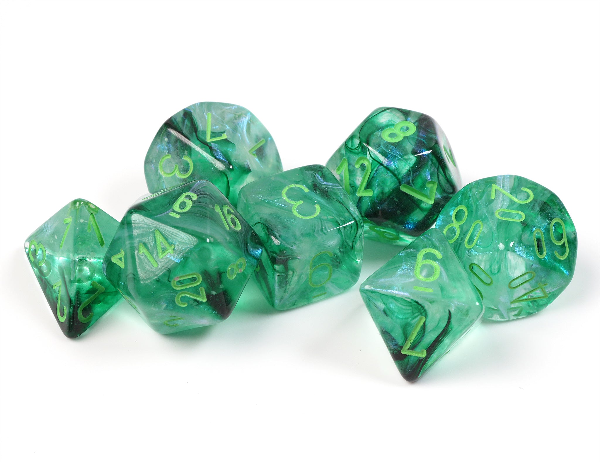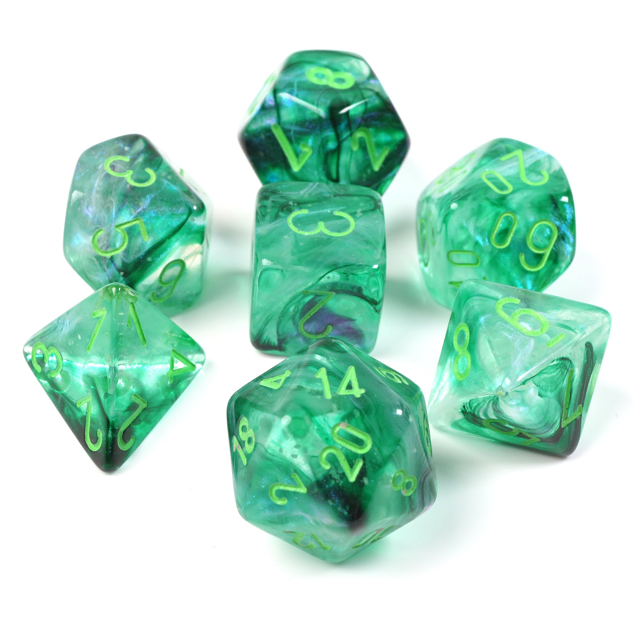 Dive into the depths with these mesmerizing Borealis dice featuring a swirled kelp green base with complimentary light green numbers. Perfect for your next tabletop adventure, these glow-in-the-dark dice cast an eerie, enchanting glow when the lights dim—ideal for those dramatic campaign moments. Whether you're rolling for initiative or deciding your character's fate, these beautifully crafted polyhedral dice bring an oceanic mystique to every game session. Watch your rolls come alive in the darkness!
