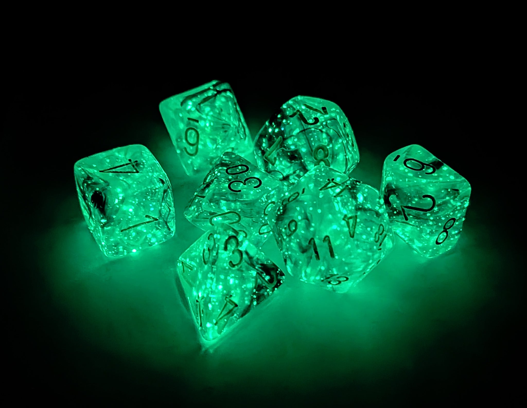 To get your dice to glow, you first need to charge them under a bright light. The longer and more intense the charge, the better the glow.
