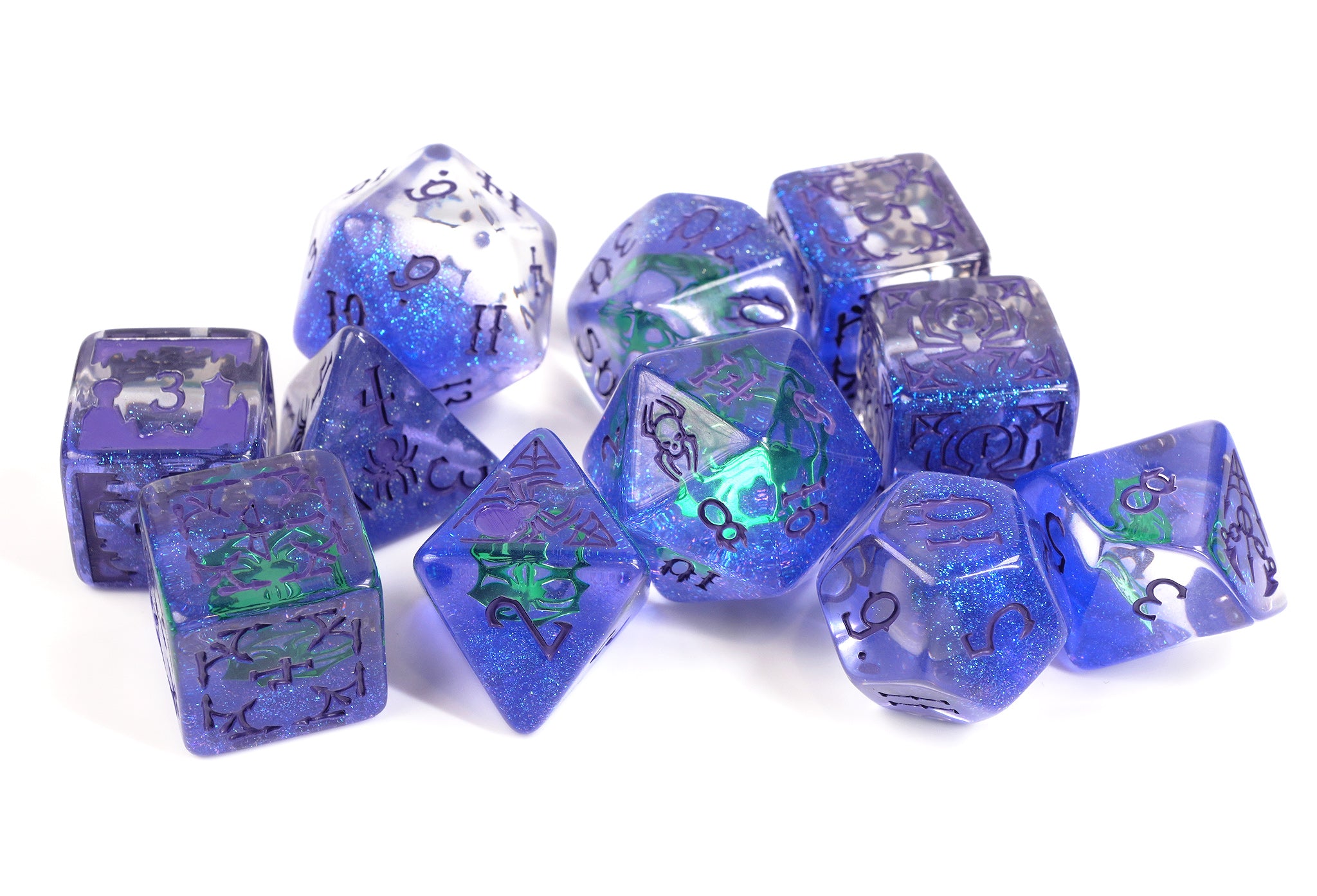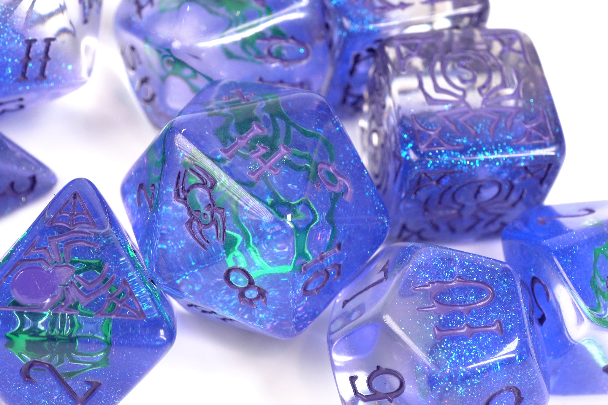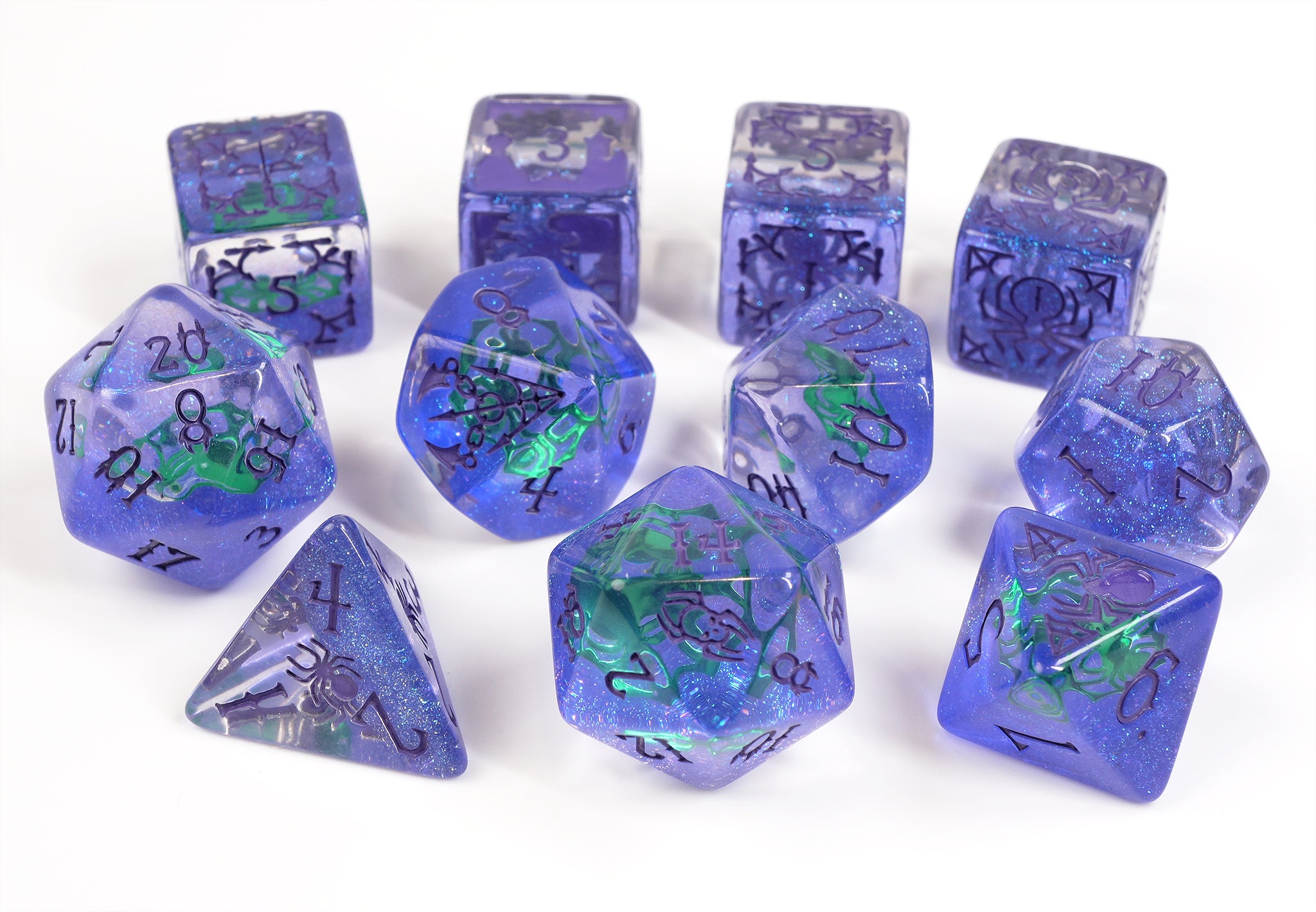 - Stunning purple glitter and green spider icon in each die
