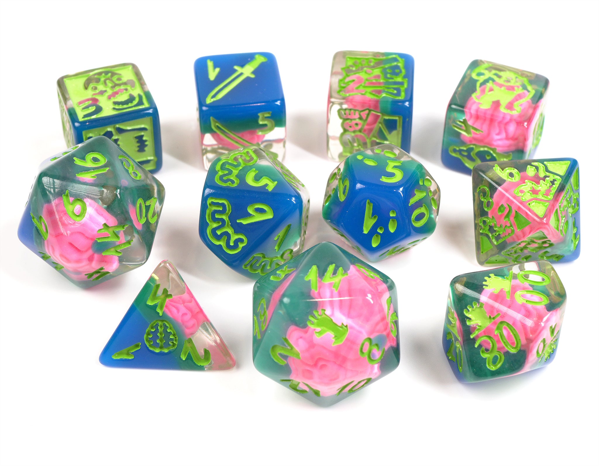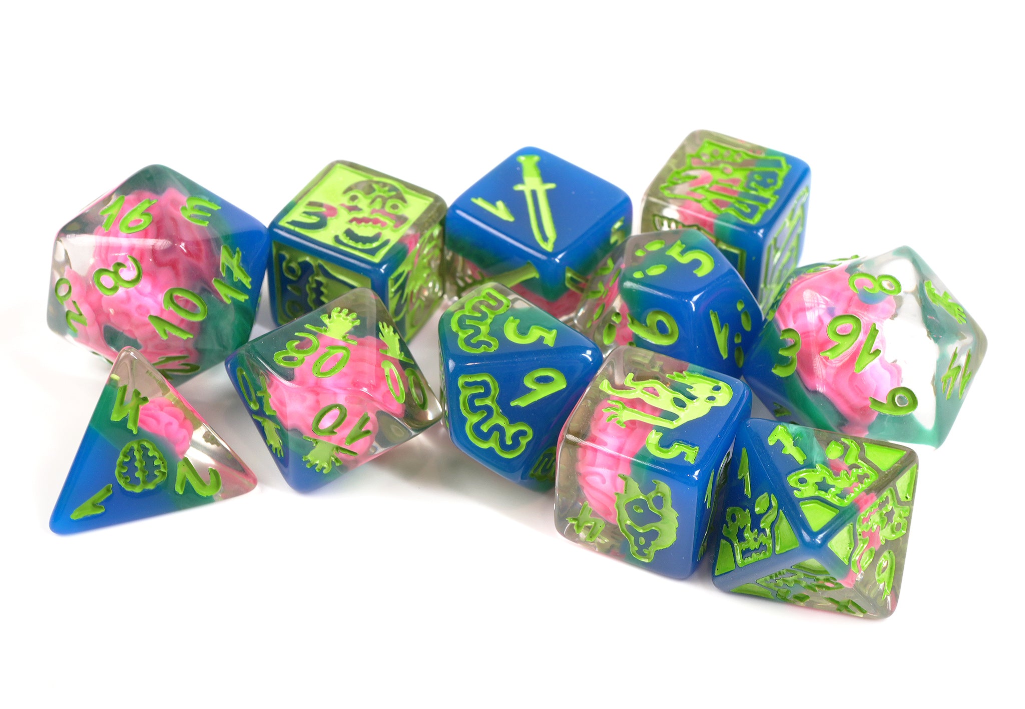 Braaaains and critical hits! This 11-piece Zombie Apocalypse dice set brings undead energy to your tabletop adventures. Perfect for D&D, Pathfinder, and any TTRPG that needs a dose of post-apocalyptic flair, this collection includes all the dice you need to survive—or at least roll your way through—the zombie horde. Whether you're a seasoned dungeon master or a fresh-faced survivor, these dice deliver the chaos and flavor your game deserves. Roll for initiative and embrace the undead theme!