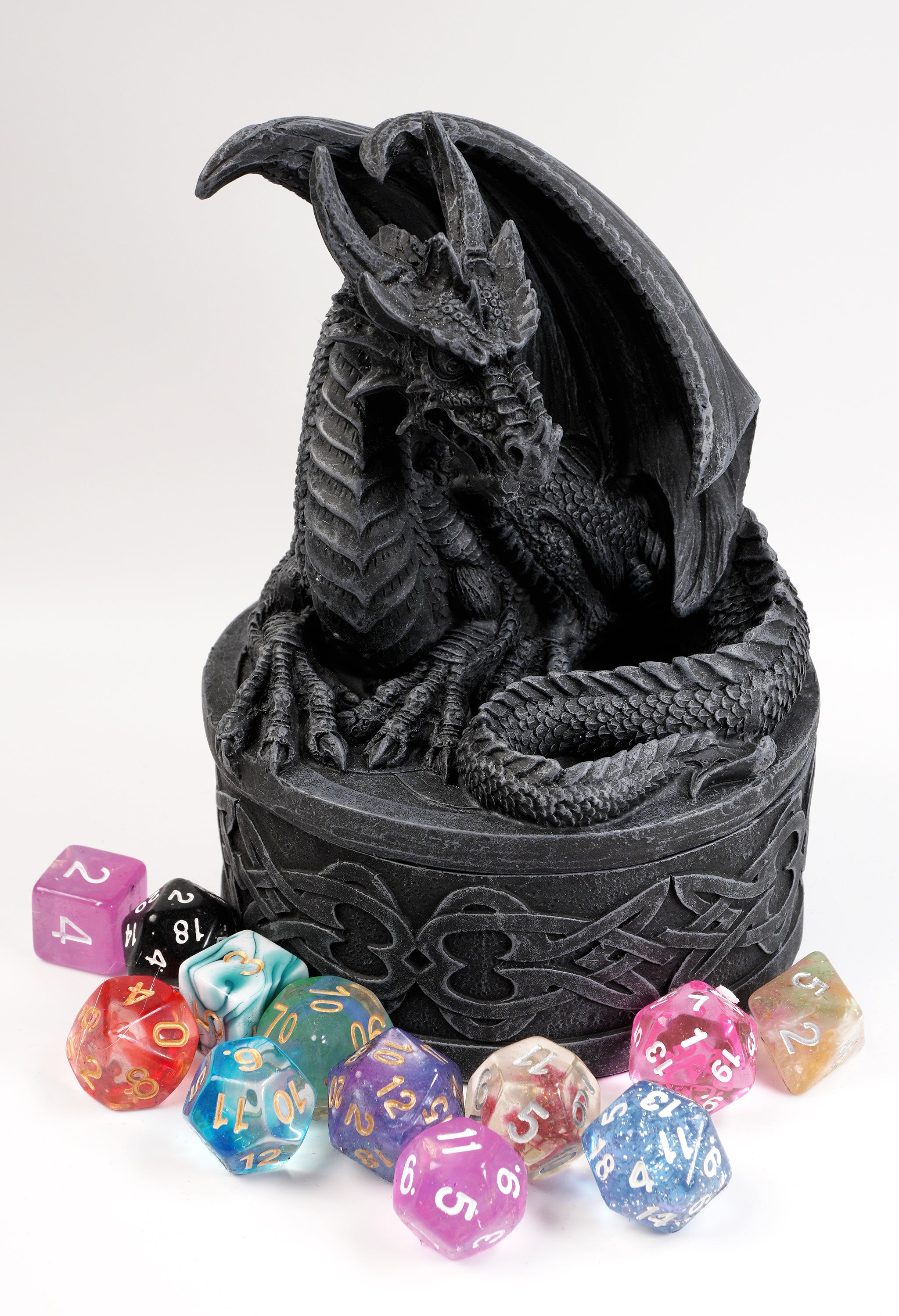 Combine ancient mystique with modern gaming in this enchanting Dragon Dice Box featuring a round Celtic base. The intricate knotwork design pays homage to fantasy lore while providing a stable, elegant foundation for your dice collection. Perfect for players who appreciate craftsmanship and character, this storage accessory keeps your polyhedral dice organized and displayed with pride. The dragon motif captures the essence of epic adventures, making it an eye-catching addition to any gaming table. Store your dice in style and let this mythical piece become the centerpiece of your TTRPG setup.