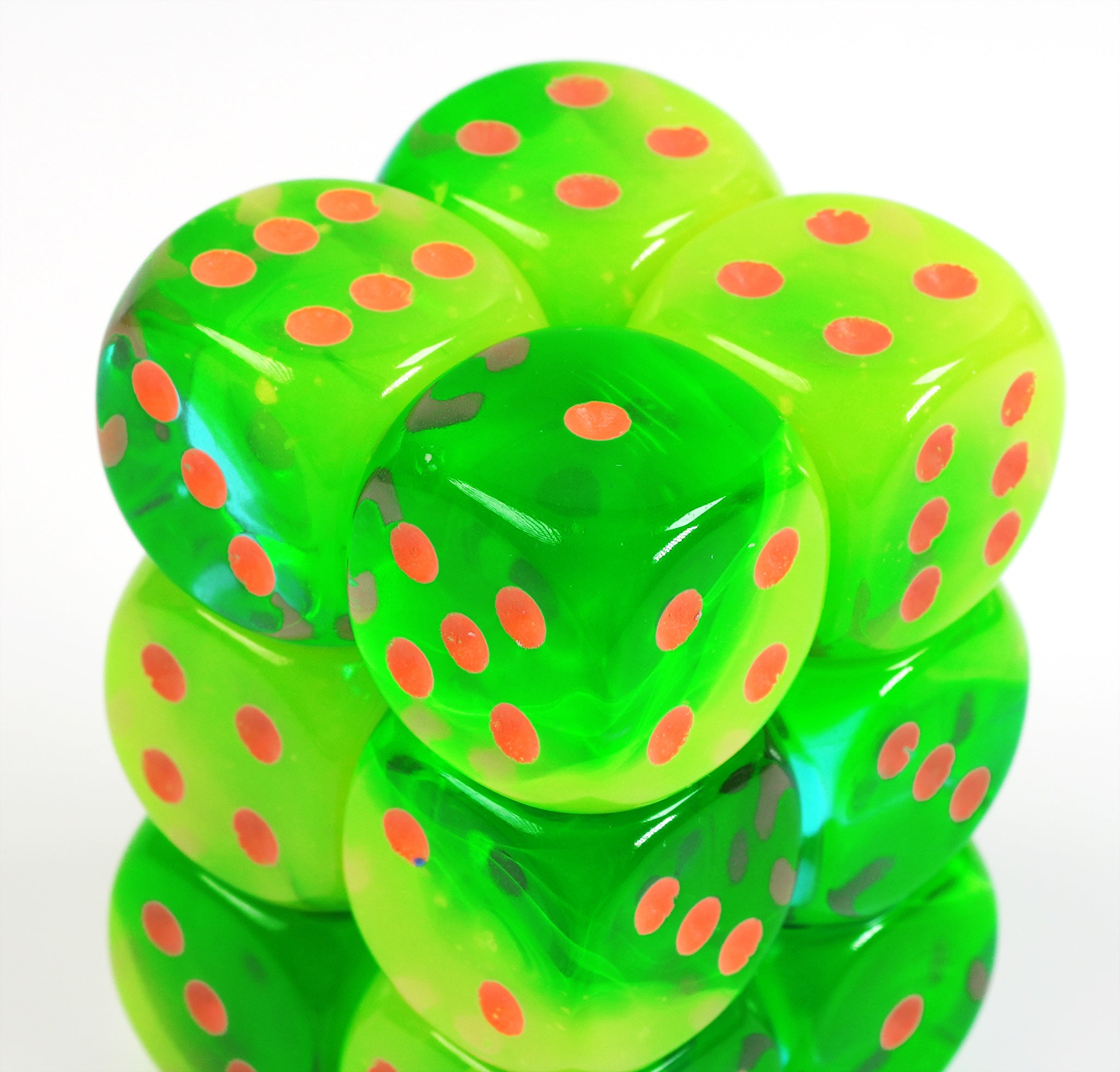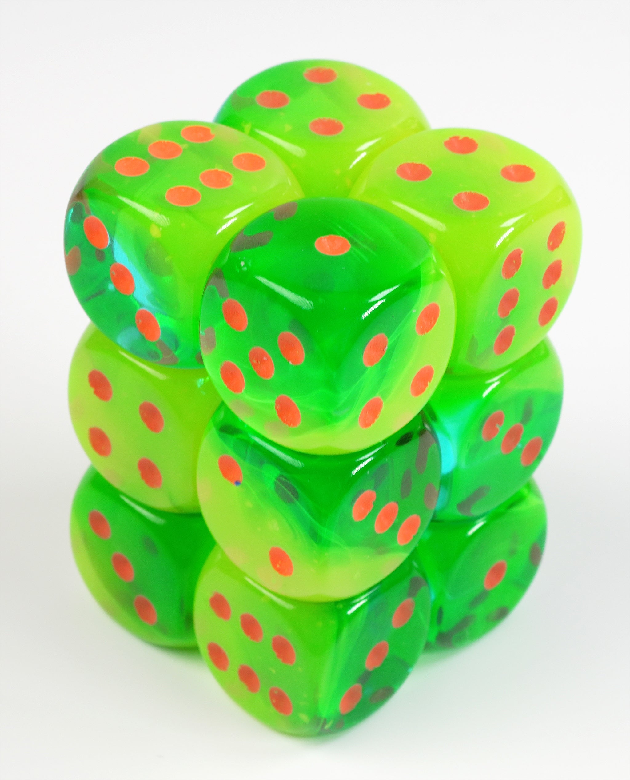 Lighten up your gaming table with this electrifying 12-pack of D6 dice showcasing a mesmerizing plasma green and teal blend accented with bold orange pips. These striking gemini dice deliver serious style while keeping the fun factor high. Ideal for dungeon crawls, board game nights, or impressing your gaming crew with some serious dice swagger. Grab a set and let your rolls shine!