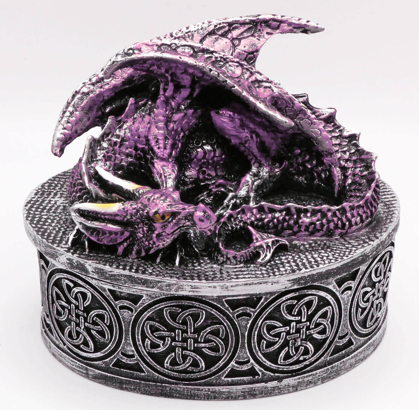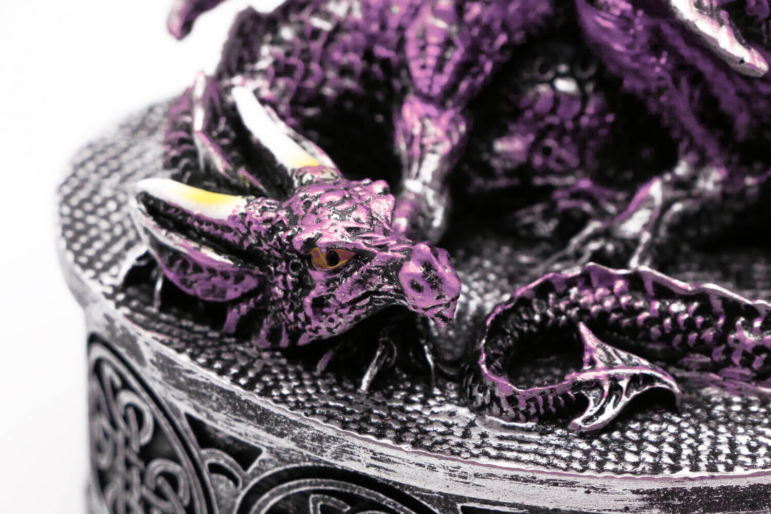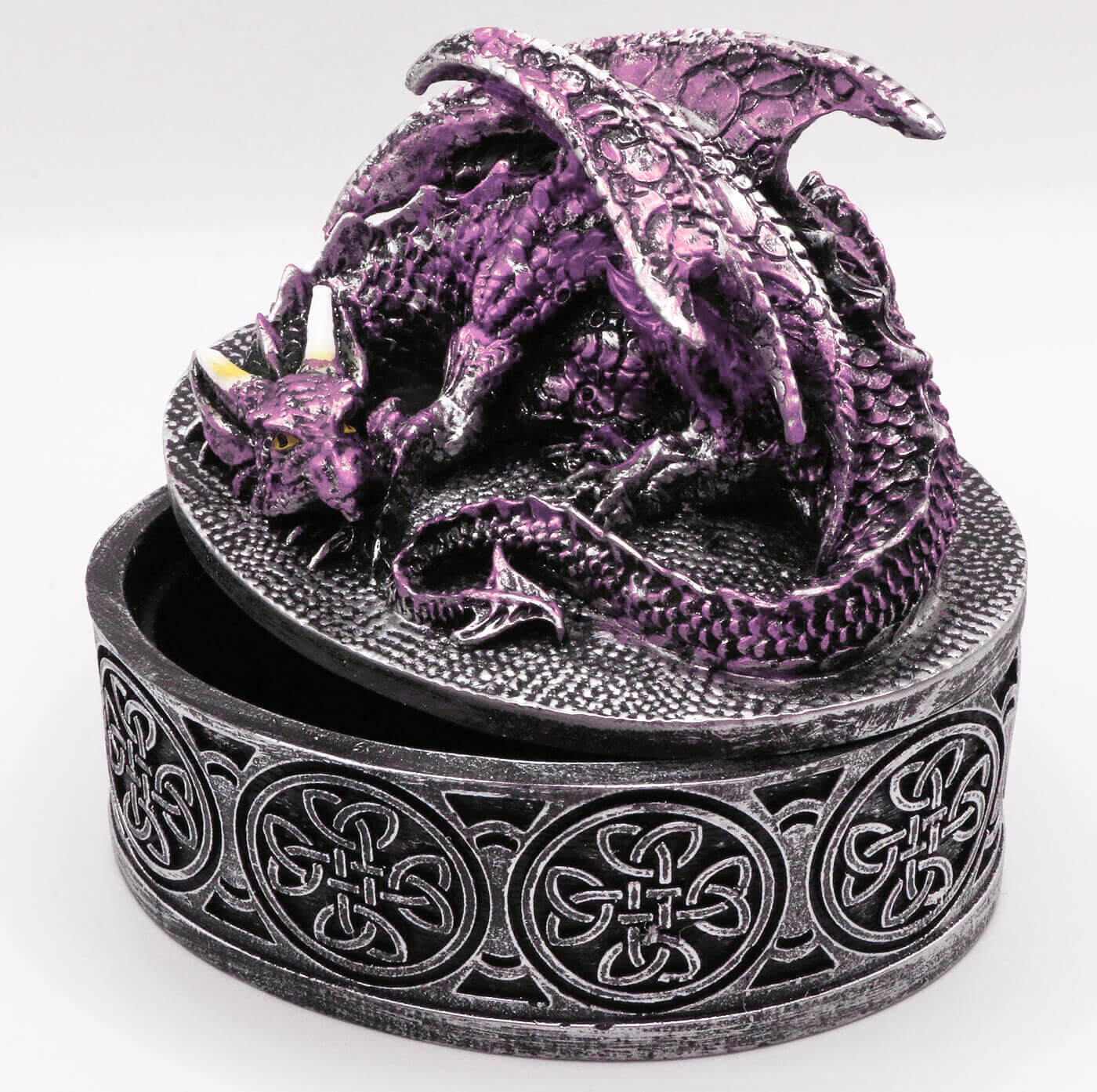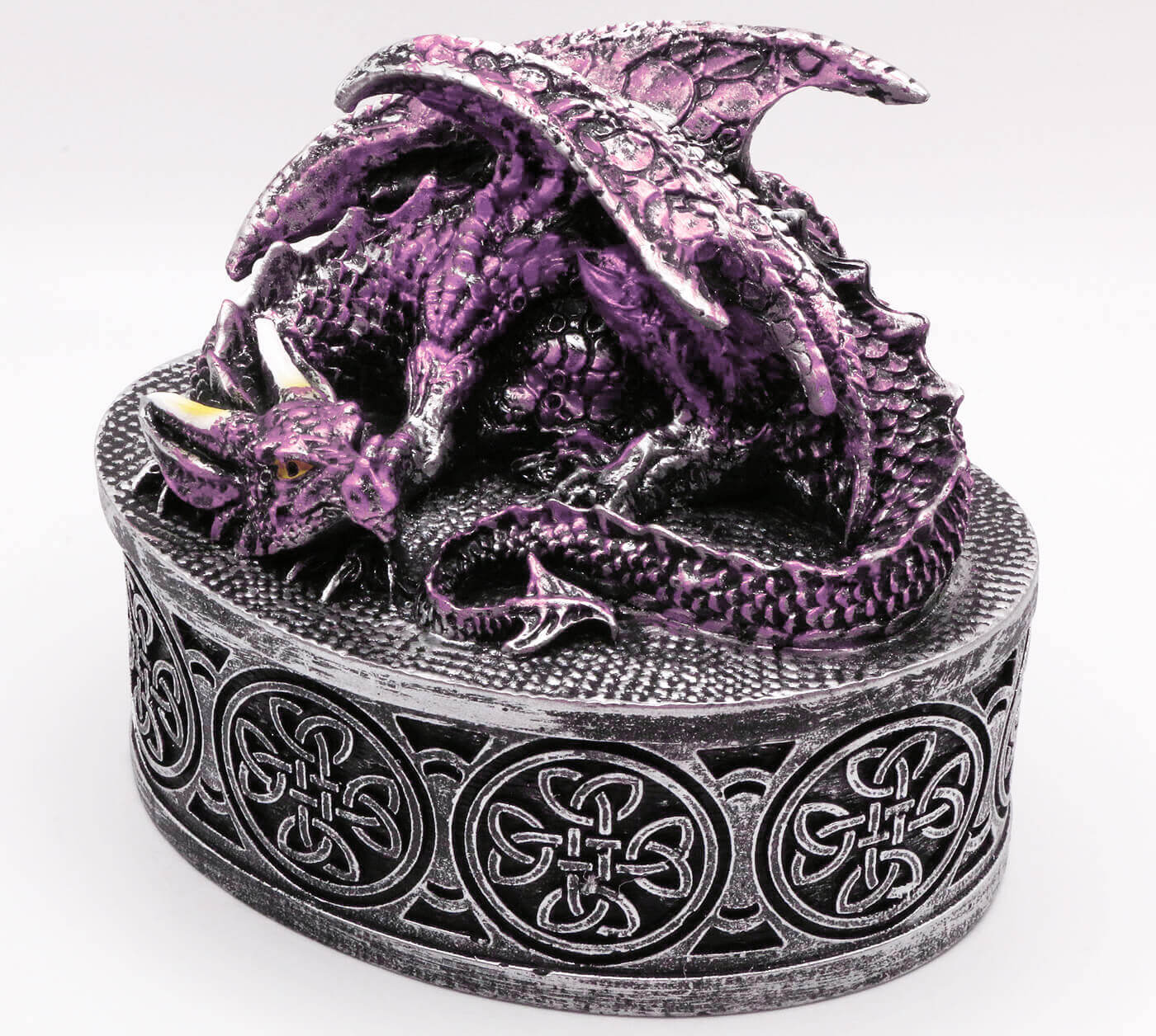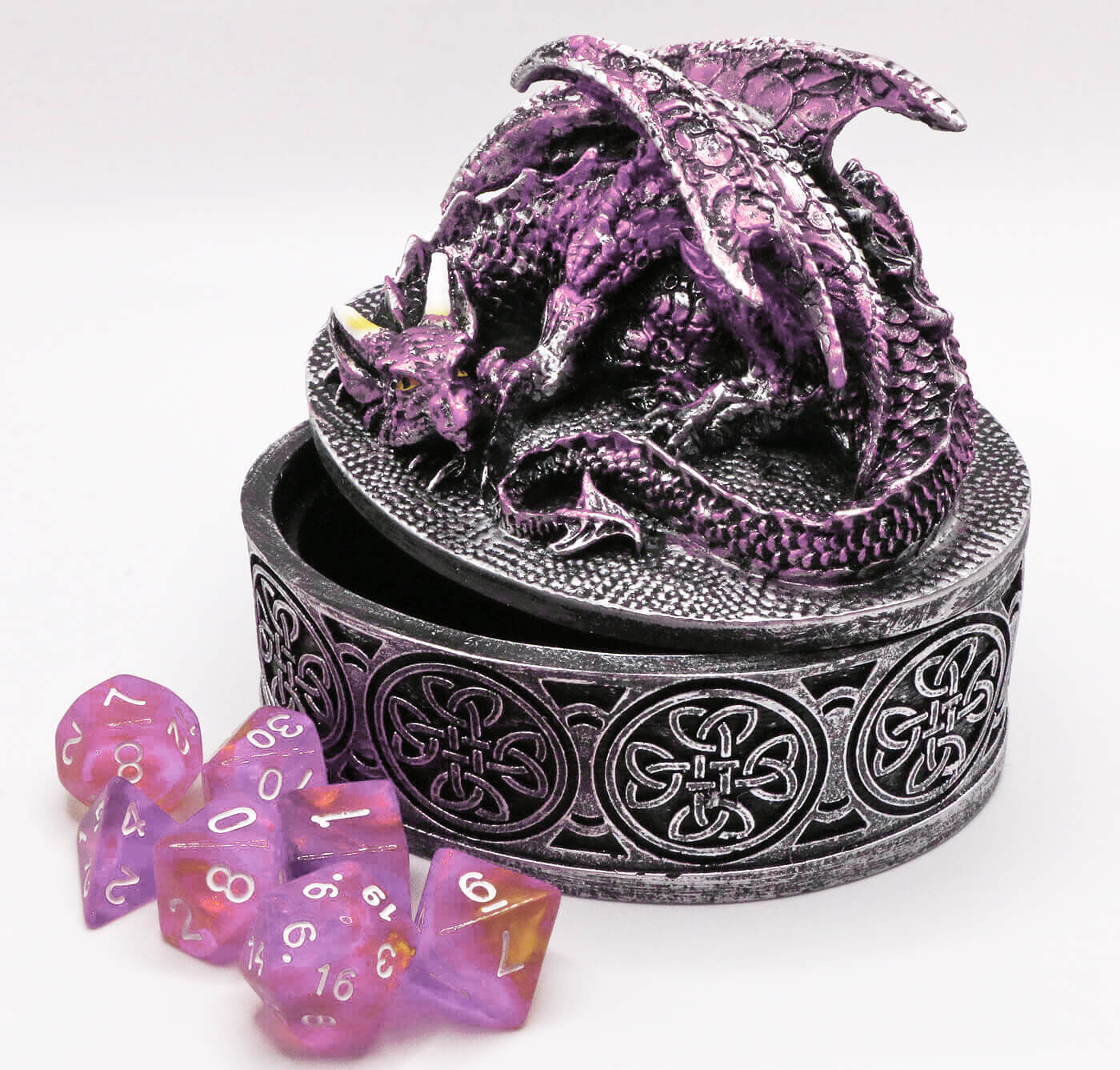 Behold the mighty dragon! Now you can store your TTRPG dice in style with a magnificent Purple Dragon dice box. This exceptional dice box features a sculpted Purple Dragon atop its removable lid and a Celtic knotwork pattern circling its base. Hand painted and stunning -- a great tabletop roleplaying game accessory for gamers and collectors.