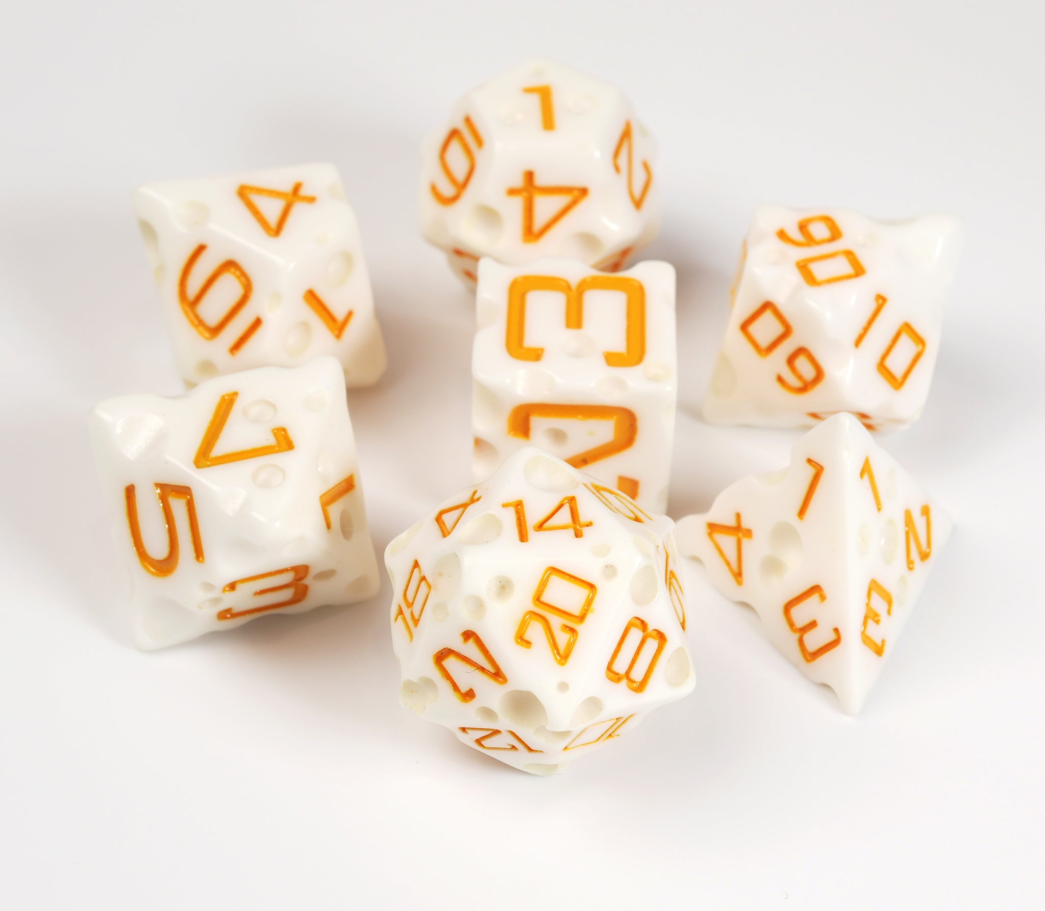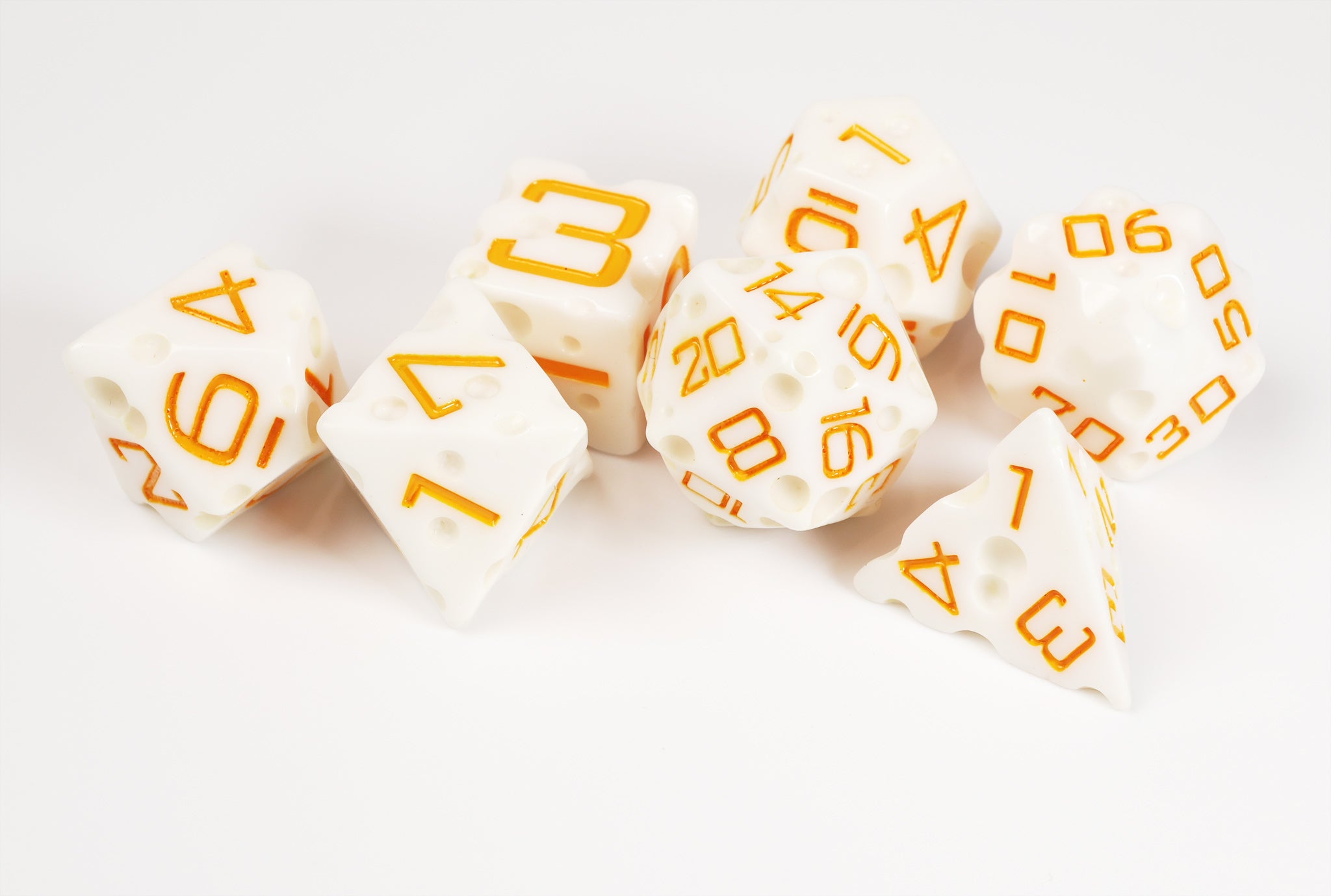 Say Cheese! Dice come in a complete polyhedral set for you to tell your own unique story: d4, d6, d8, d10, d00, d12, and d20. Perfect for Dungeons and Dragons and all your favorite tabletop games.