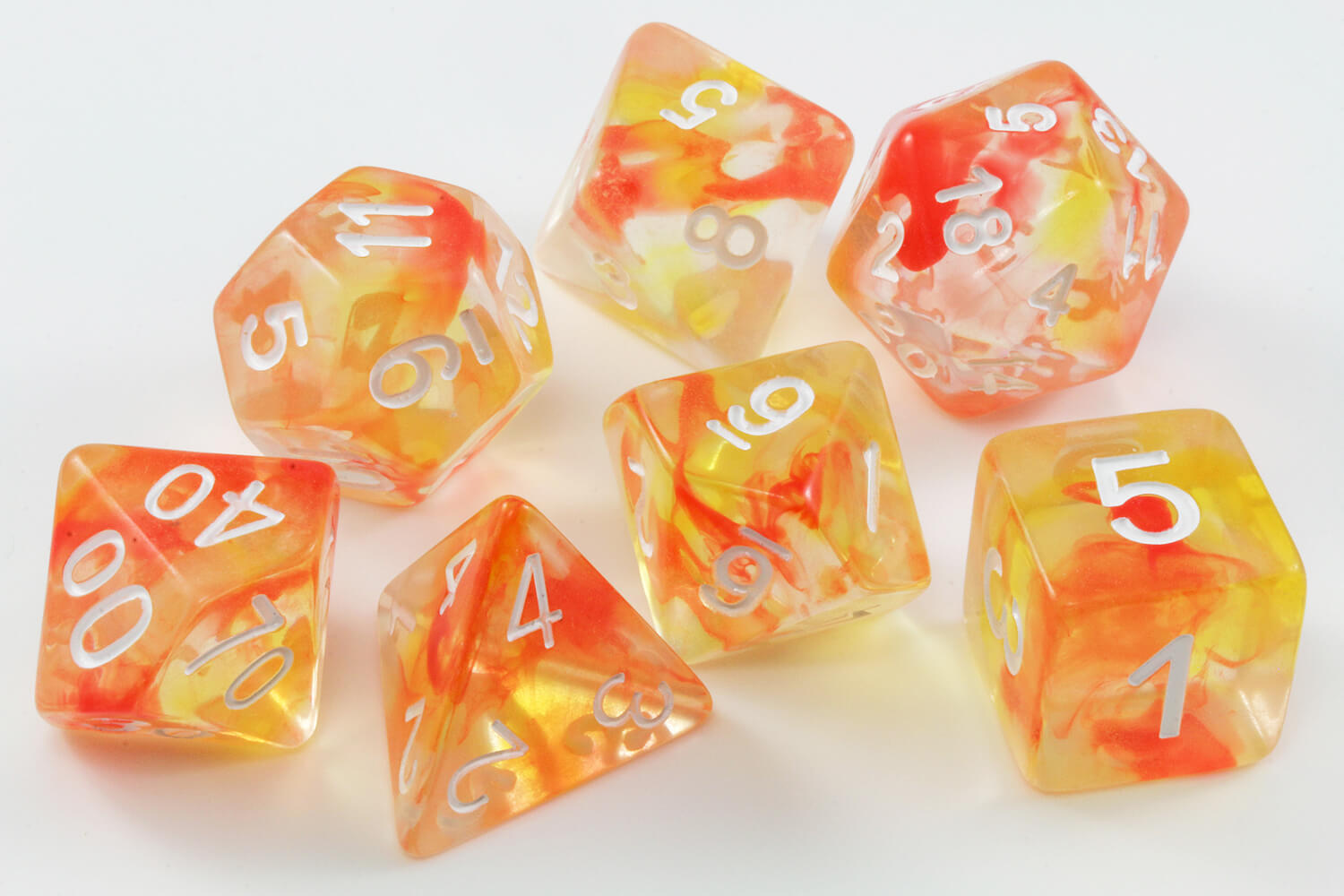 Prepare for the adventure of a lifetime with Venom Dice Mix (Orange and Red). These awesome dice are a clear acrylic that have been injected with swirls of inky orange and red. The tendrils of color seep ominously throughout each die. Numbers are inked in white for easy reading after every roll. Great dice for rogues and stealth-based characters.
