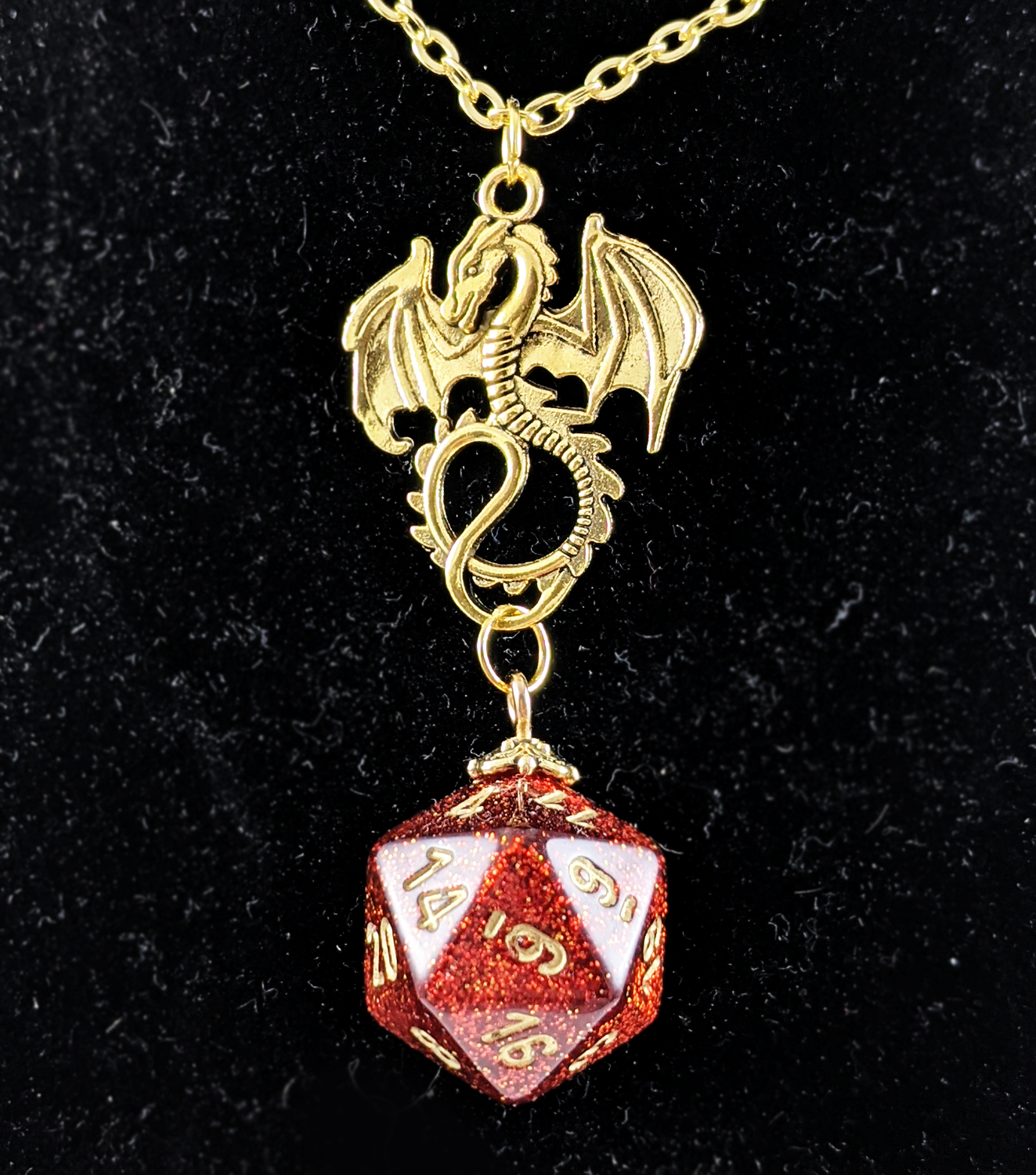 Dragon Charm Necklace With Glitter D20 (Ruby Red) | Gold