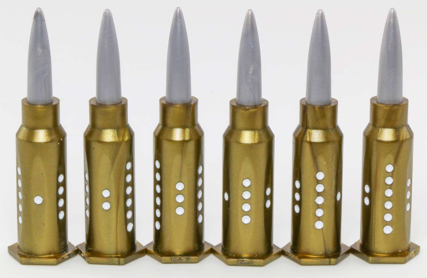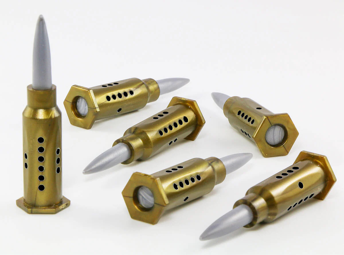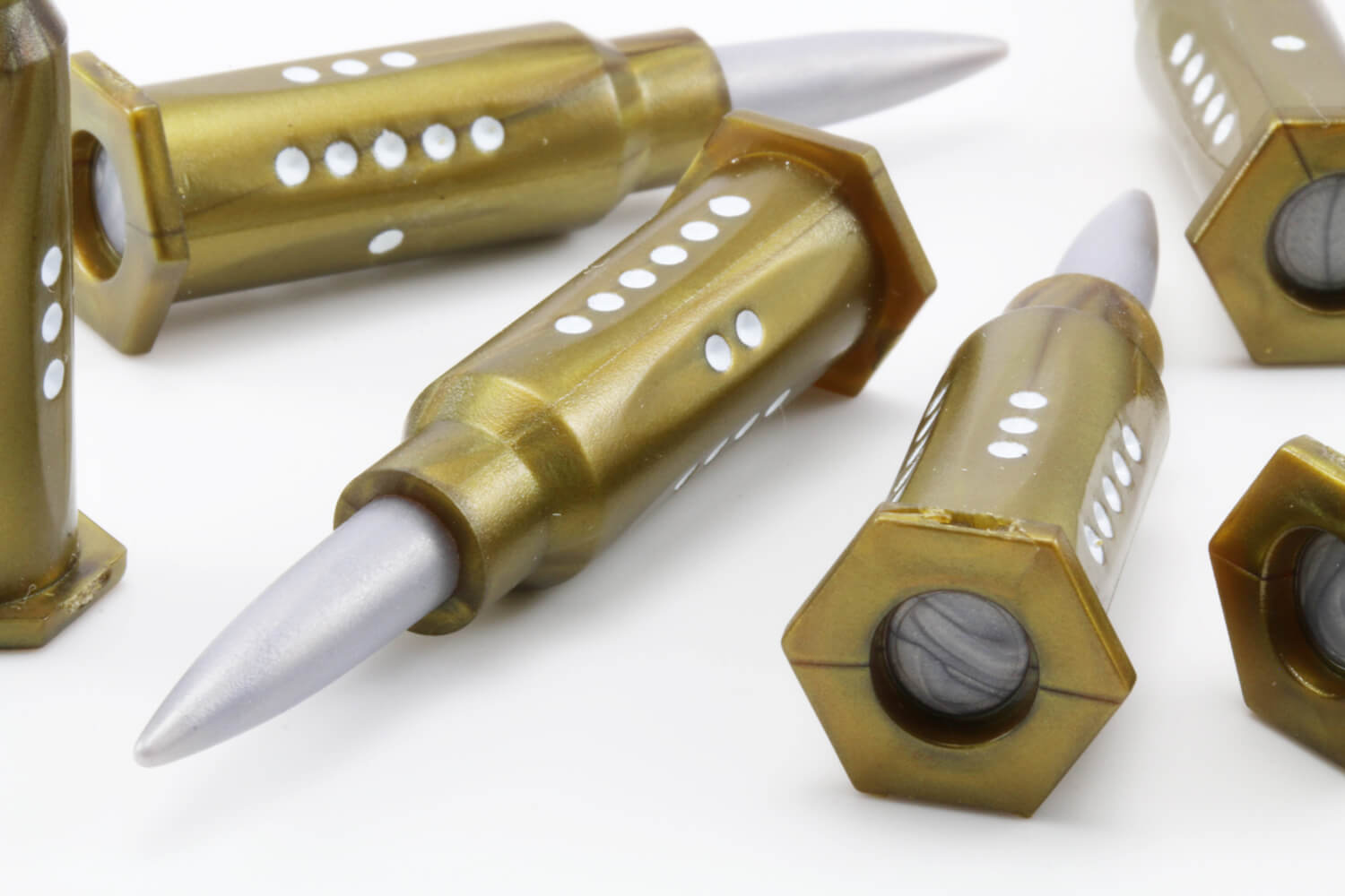 Replace your standard six-sided dice with these bullet shaped dice and bring the heat! Perfect for tabletop war games and roleplaying games. Each set includes six dice.