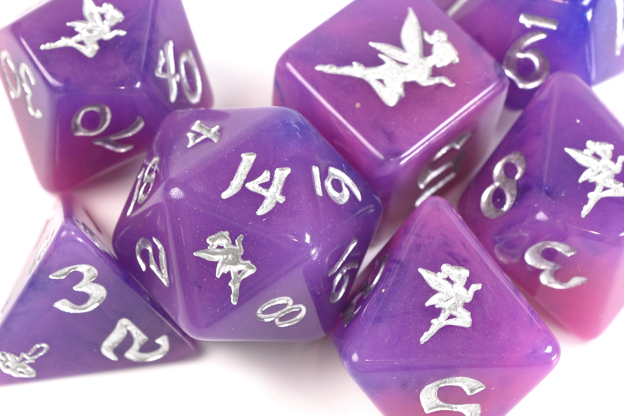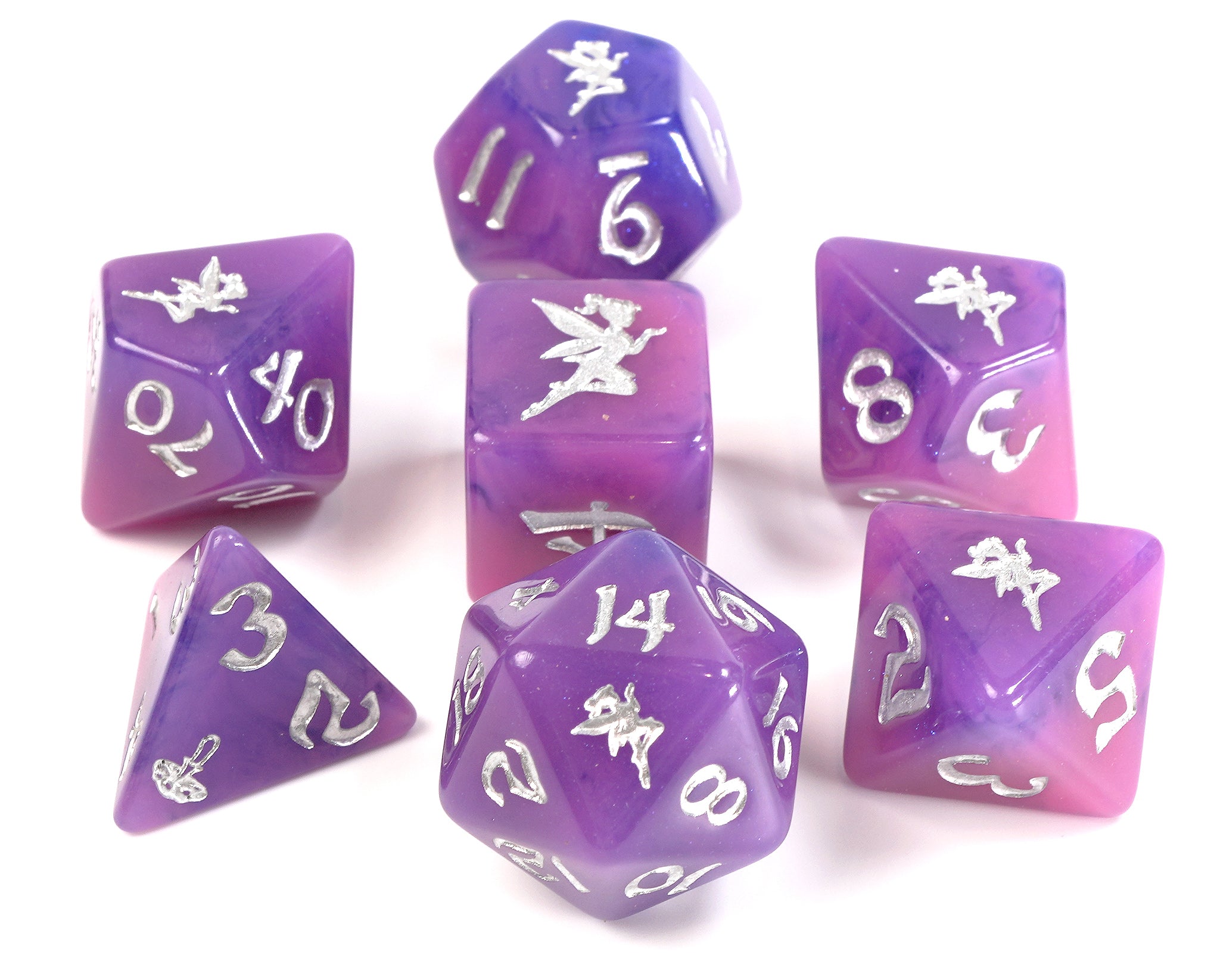 - Easy-to-read silver font with fairy logo on high numbers and cute mushroom on d4