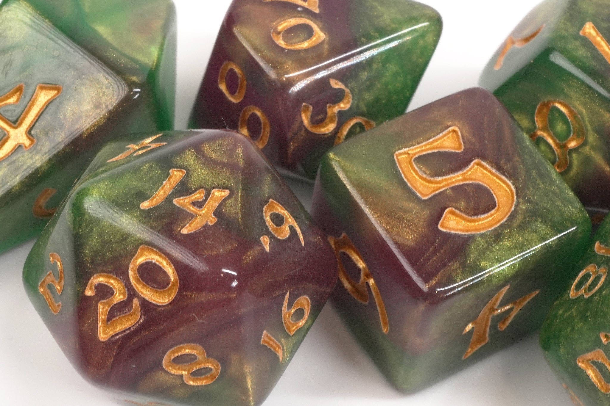 Unleash toxic power with this menacing 8-piece dice set, featuring a striking blend of forest greens and shadowy reds that evoke the deadly essence of wyvern venom. These Wyrmforged dice practically glow with malevolent energy, perfect for villainous campaigns, dark fantasy adventures, or any moment when you need to roll with an edge. The premium construction ensures reliable performance through countless quests, while the bold coloring makes every die instantly recognizable across the table. Whether you're plotting schemes or facing down impossible odds, these dice bring the perfect dose of danger to your game night.