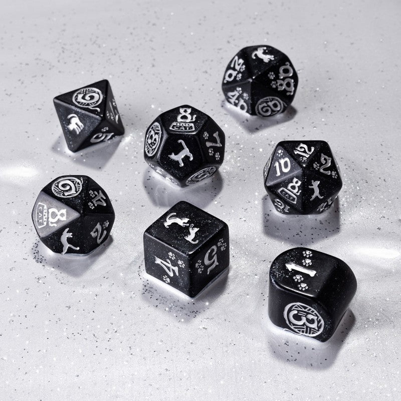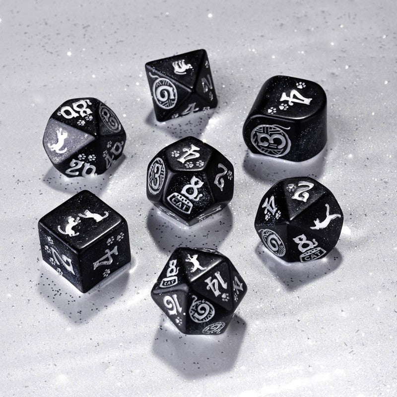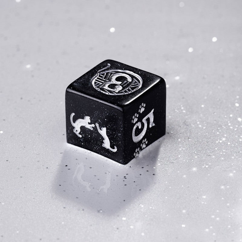 The dignity of the shimmering black. This design shows ball yarns, milk bowls, paw prints, and cat ears on feline-vibed digits, plus silhouettes of playful cats on highest faces! It is especially visible on the Modern D4. The shimmering black material brings about their affiliation with fate and magic, while the silver engravings are like stars in the night sky. Will they bring you luck?