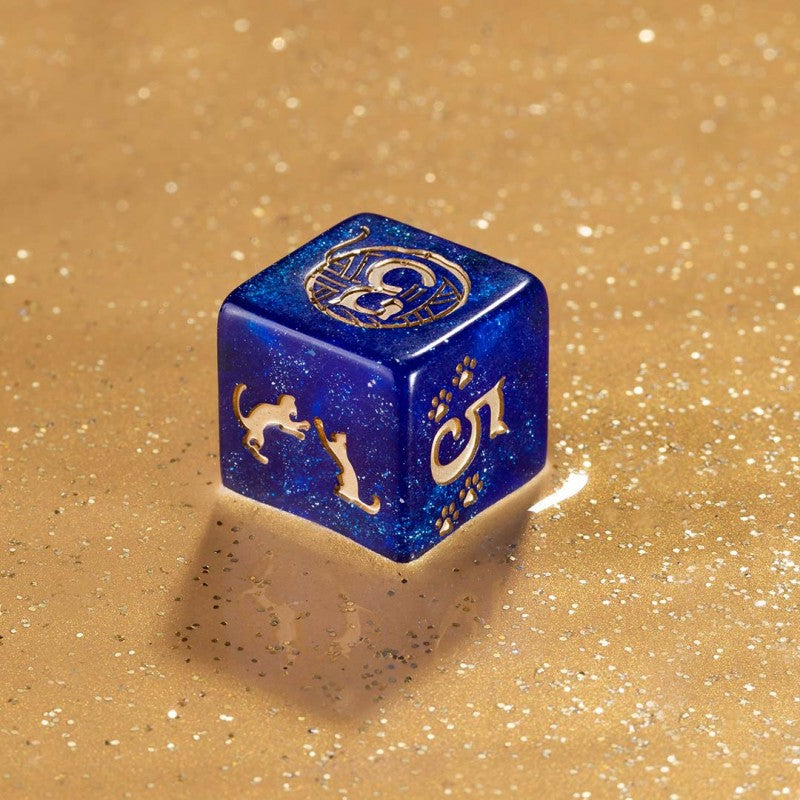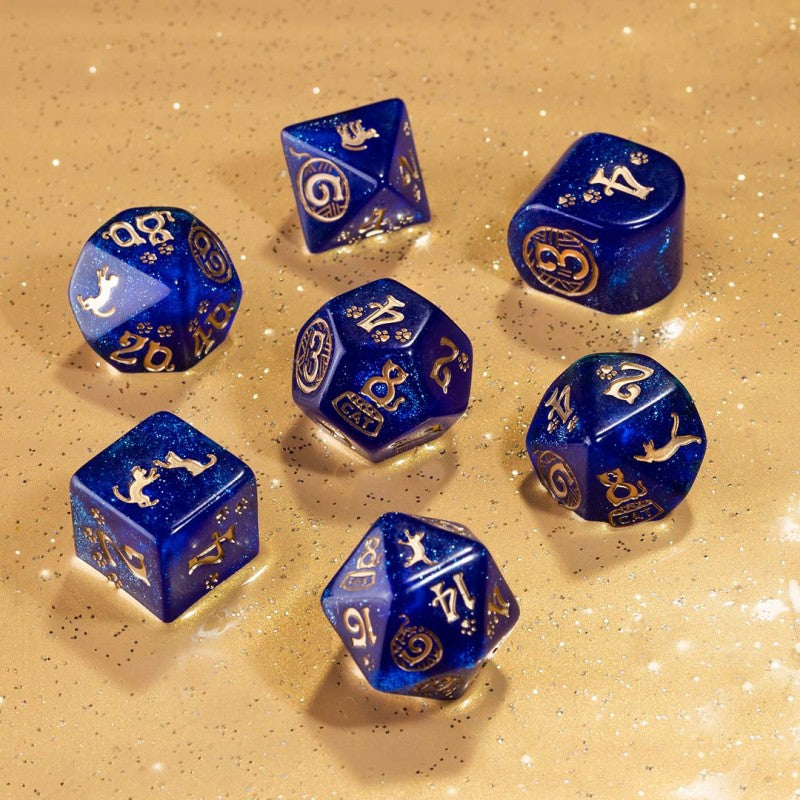 How to beat the bad luck? This design shows ball yarns, milk bowls, paw prints, and cat ears on feline-vibed digits, plus silhouettes of playful cats on highest faces! It is especially visible on the Modern D4. The shimmering blue material resembles an evening sky, while the golden engravings are like embers from the campfire. These dice will help you to break away from destiny!
