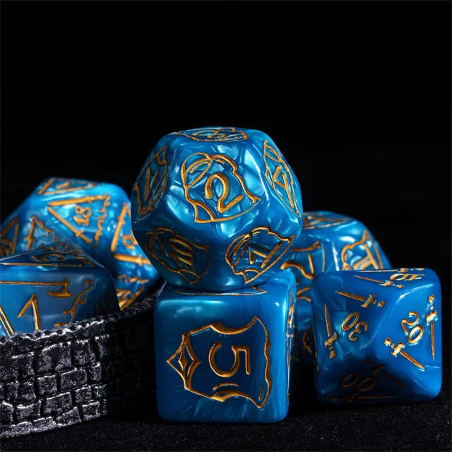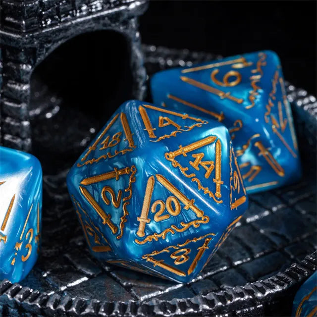 These dice are impressive. Each oversized die is crafted in a beautiful pearlescent color. The etched, easy-to-read gold numbers are are offset with carvings and designs of arms and armor.