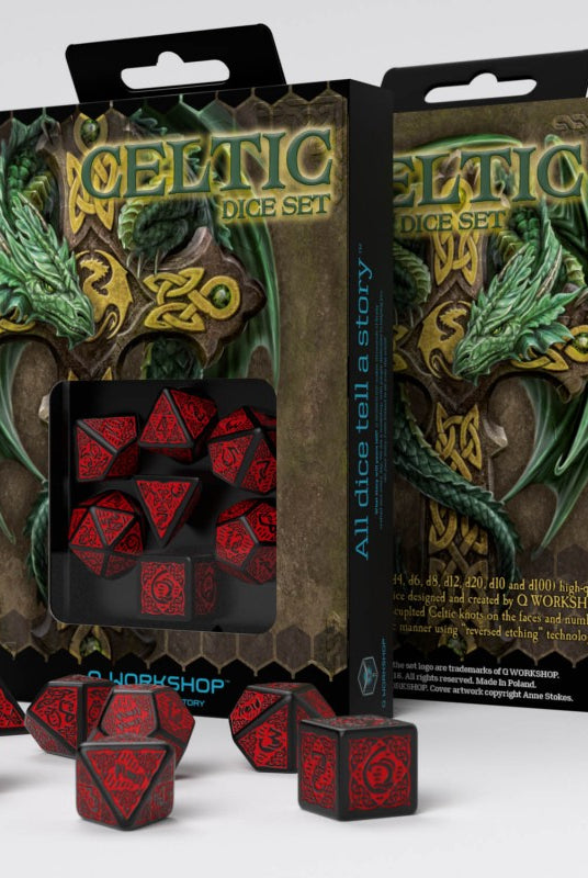 Shop for Celtic Dice on Dark Elf Dice. These finely crafted RPG dice by Q-Workshop feature intricate patterns of Celtic knots and designs on the faces and numbers. Celtic dice are quite simply some of the most gorgeous dice we sell. RPG sets are available in solid, opaque colors, and include all your favorites: d4, d6, d8, d10, d%, d12, and d20. Perfect dice for DnD, Pathfinder, and all the best tabletop role playing games.
