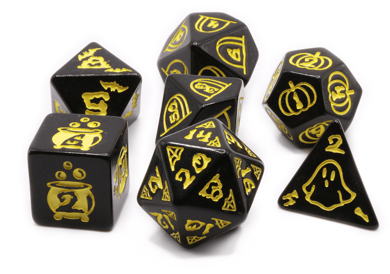 Get ready to roll with Halloween dice! This special edition dice set is perfect for gamers, ghosts and goblins. Each die is carved with fun Halloween symbols and numbers inked in yellow. Spooky fun for players and game masters alike. Includes all the dice you need for your favorite tabletop roleplaying games: d4, d6, d8, d10, d00, d12, d20.