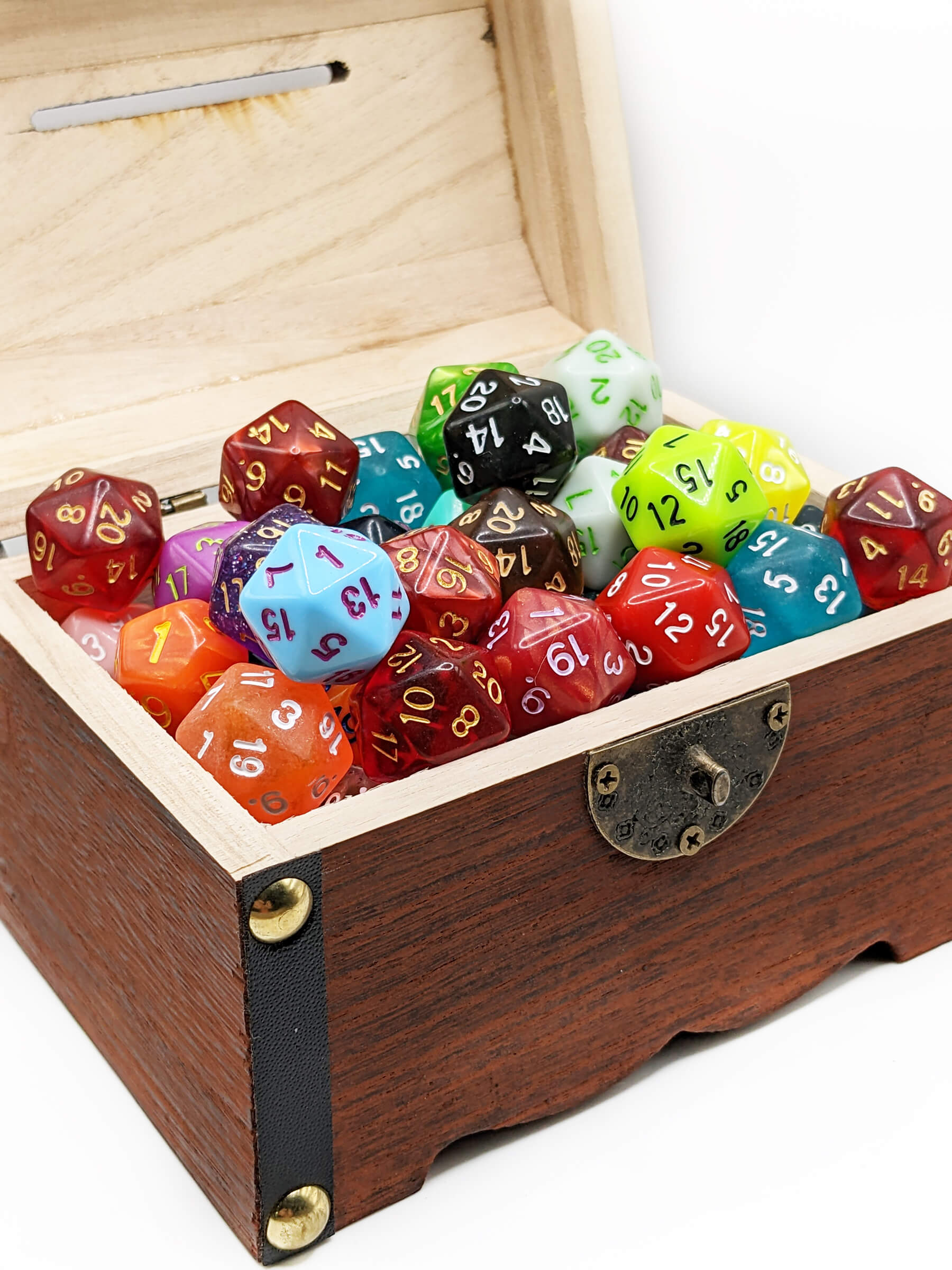 This handcrafted dice box is a great way to store and showcase your favorite RPG dice and other treasures. Larger than our other boxes, this treasure chest holds approximately 75 standard dice. Dice box features a slotted top, padlock and key, and secure metal handle and clasp. Brown staining.