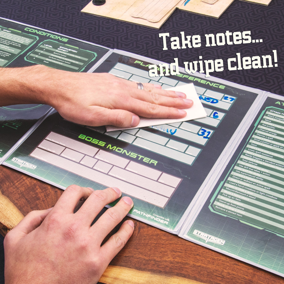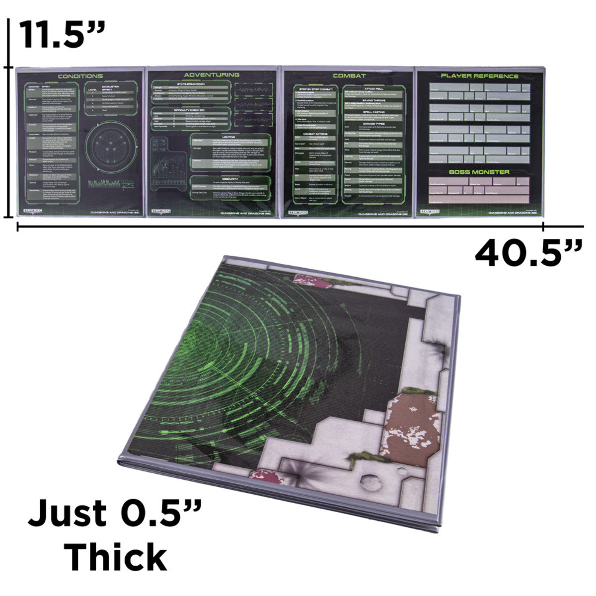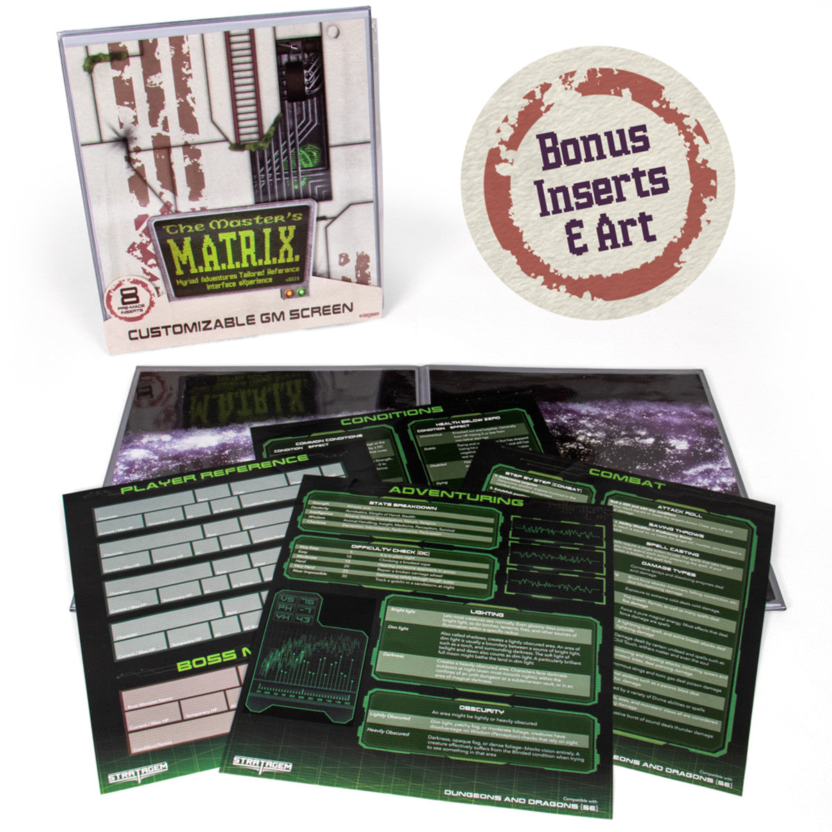 The Master's Matrix is the DM screen to rule them all! This amazing, customizable DM screen is the perfect gaming accessory for all Dungeon Masters. This handy 4-panel DM screen has 8-pockets that each fit a regular sized sheet of paper. Fill the pockets with your own artwork, maps, tables, charts, and whatever information you need for your specific campaign. Changing games? No worries! Just switch out the papers and you're all set for the next adventure.