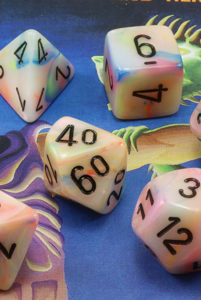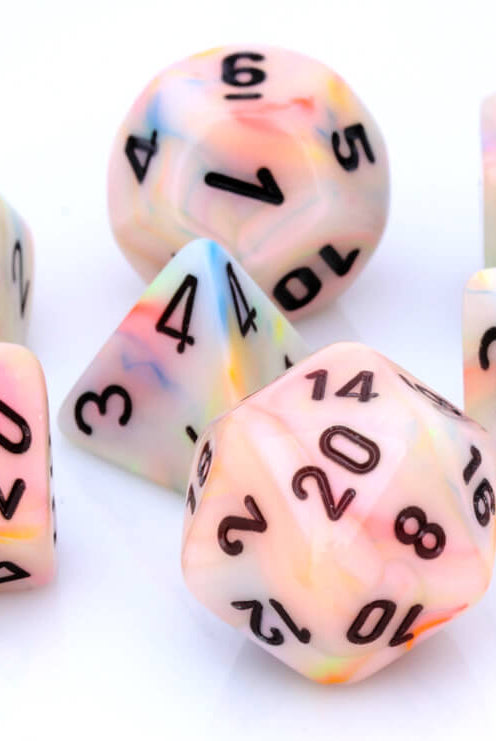 Dark Elf Dice stocks a myriad of role playing dice and game supplies. That said, Festive dice are undoubtedly some of the most colorful dice we sell. Available in a medley of colors, these dice are just what you need for Dungeons and Dragons, Pathfinder, and all your favorite role playing games. Each set includes all the dice you need to create the adventure of a lifetime: d4, d6, d8, d10, d percentile, d12, and d20. With the Festive collection, RPG dice have never been so much fun!