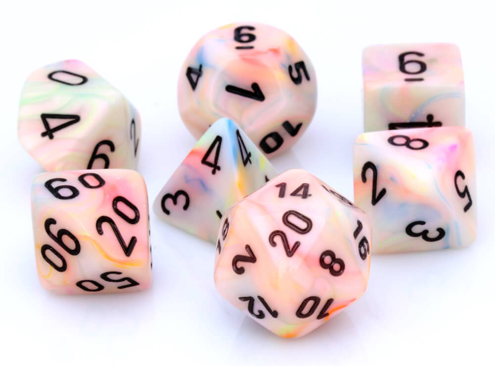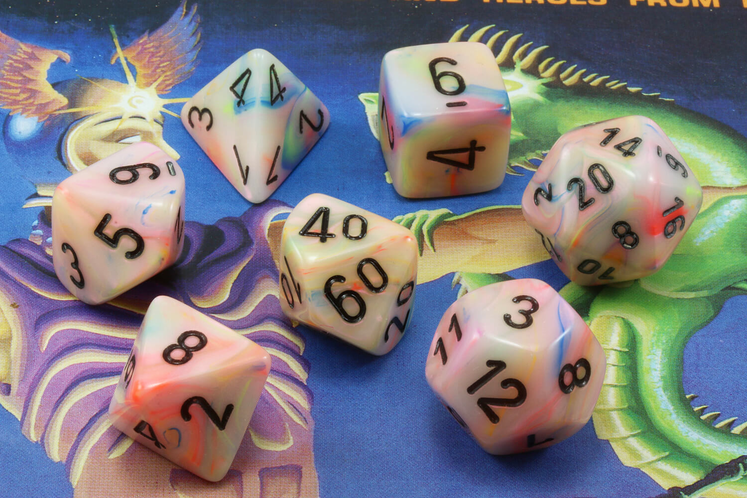 Keep the fun rolling with FestiveĀ (Circus). This 7-piece RPG dice set has all your favorites: d4, d6, d8, d10, d%, d12, and d20.