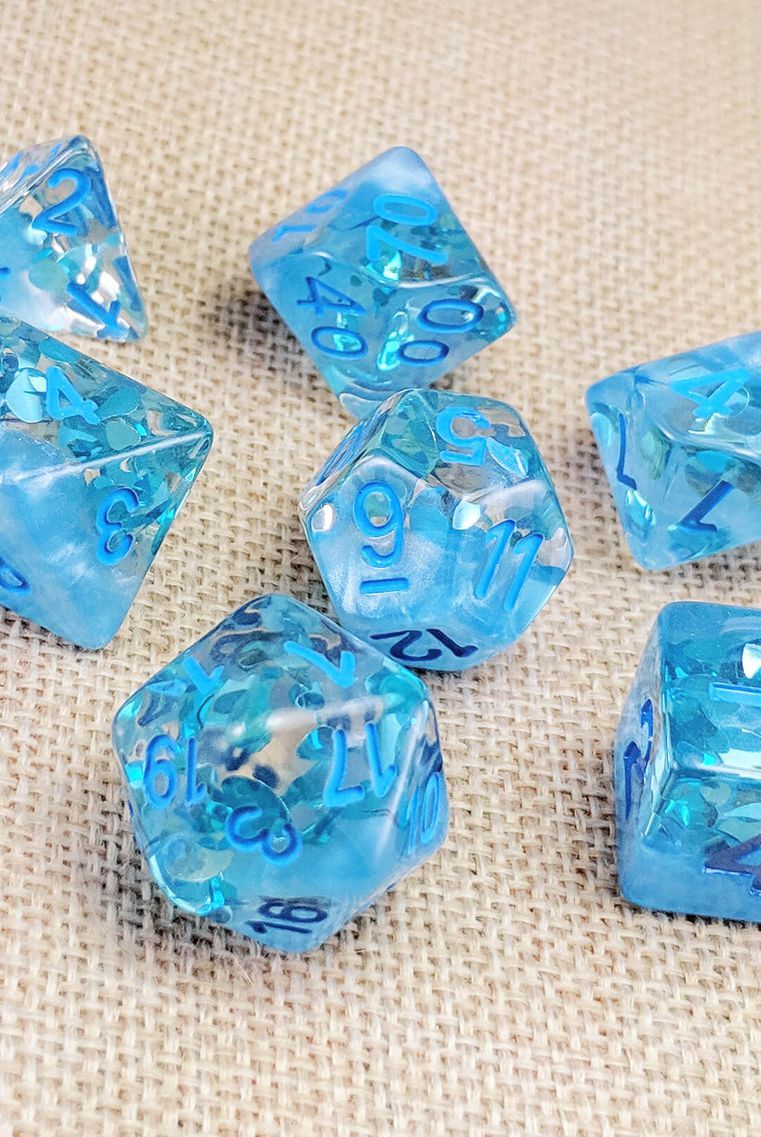 Spring, Summer, Autumn, and Winter -- all four seasons are represented in this stunning new dice collection. Four Seasons dice are cast in layers of crystal clear acrylic and pearlized opaque color. The clear layer is infused with leaves, snowflakes, or ocean waves to represent each particular season.
