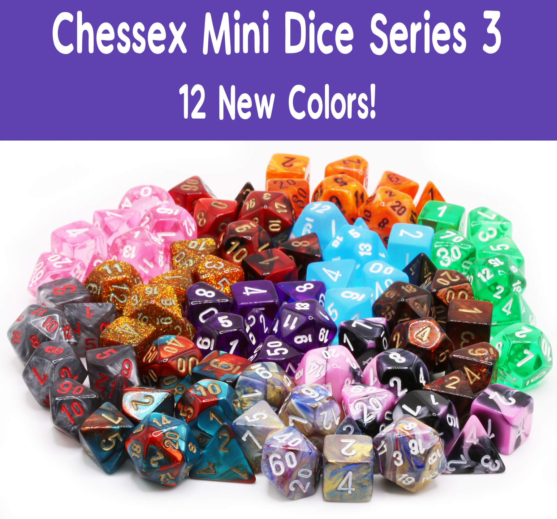 Gnome tested and halfling approved, the new Chessex mini dice Series 3 are here! Just like their bigger cousins, Chessex mini dice are bursting with color and come packaged in a clear cube box (only smaller) favored by collectors and dice goblins from here to Rivendell.