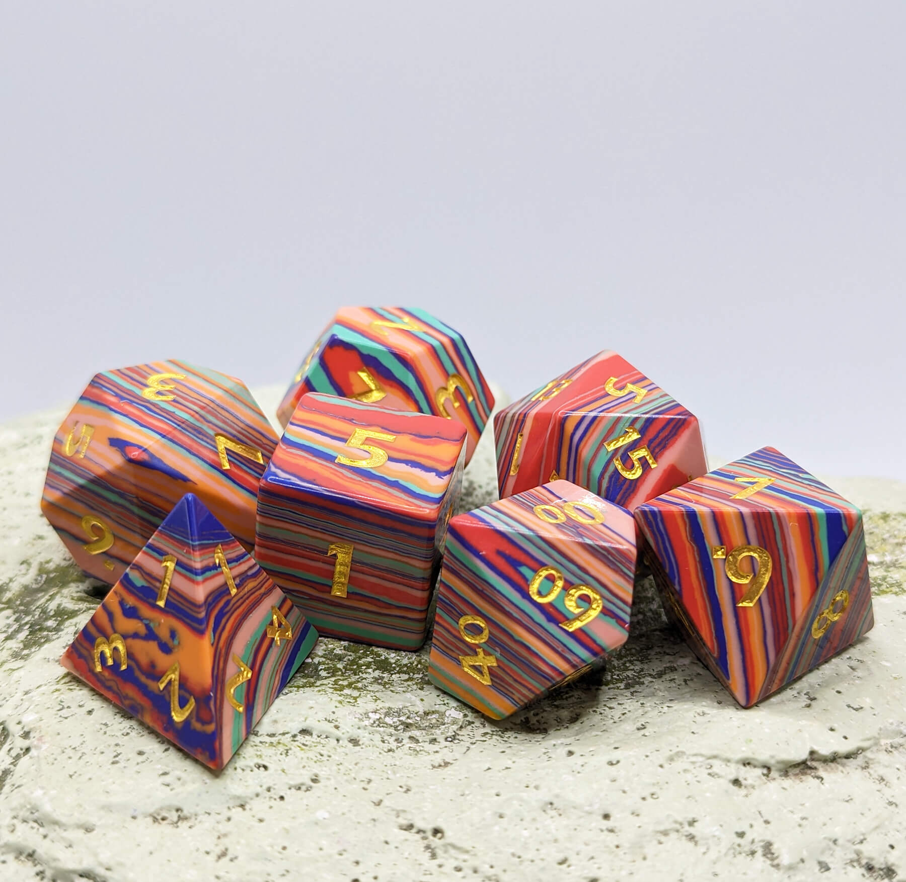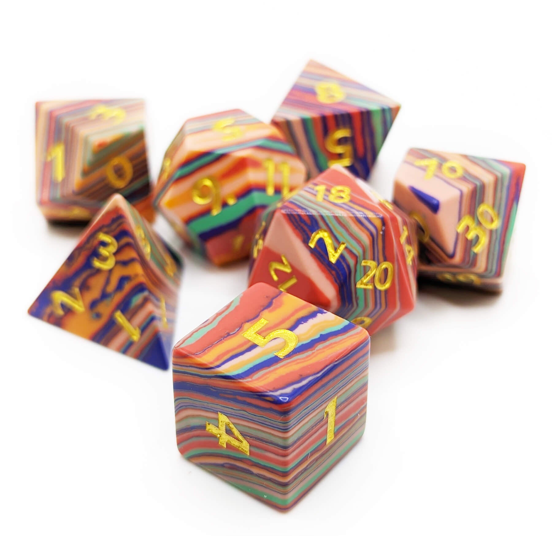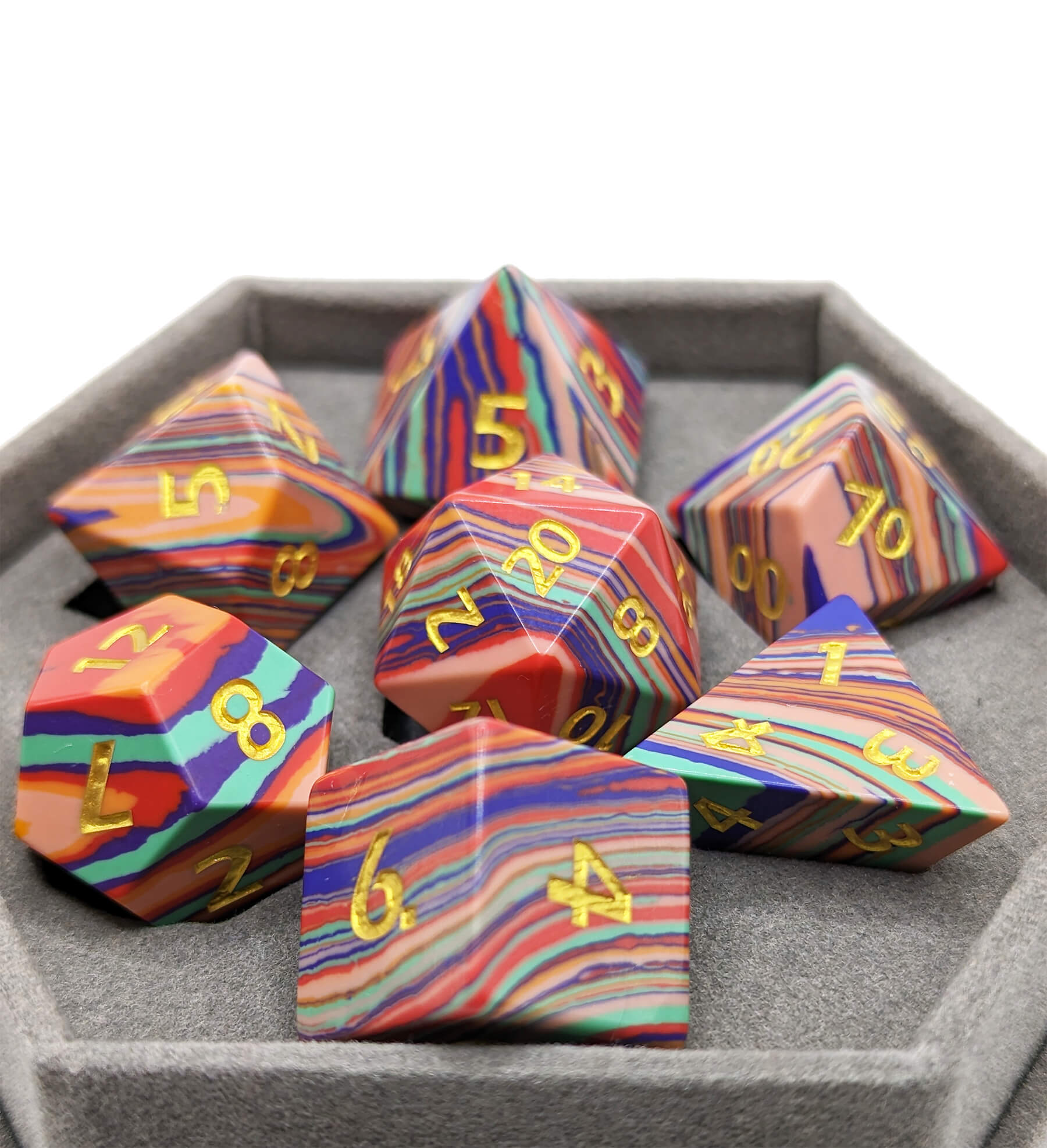 If you're looking for premium dice look no further! This 7-piece dice set is crafted from synthetic, rainbow stone with colorful striations. The dice are heavy in the hand and look stunning. Use the dice in your next TTRPG campaign or as an awesome conversation piece.