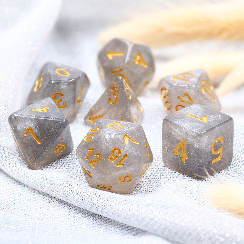 With overcast gray and sparkly iridescent glitter, Silent Night Dice are reminiscent of a wintery night sky.