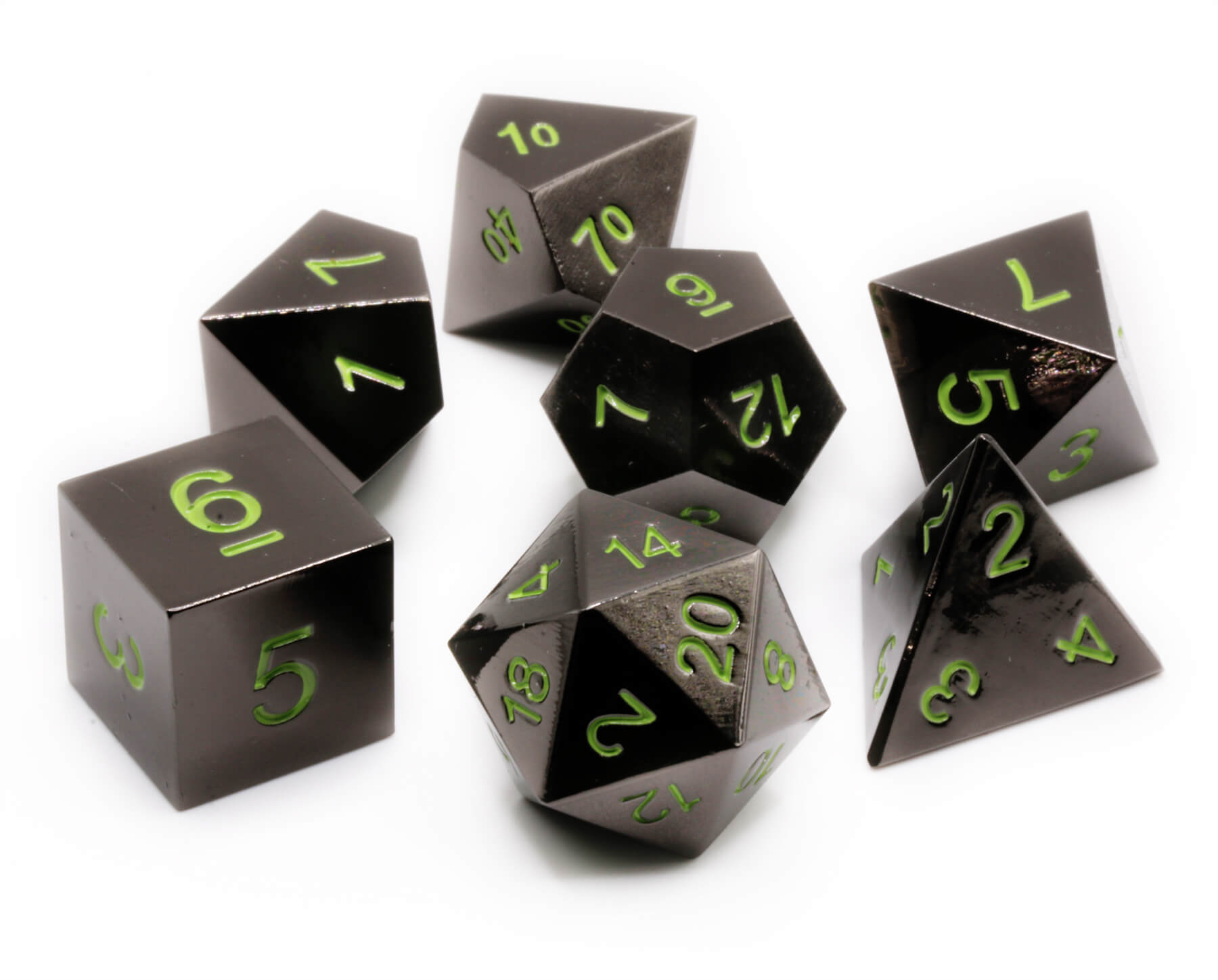 Metal Dice Set (Shiny Black With Goblin Green Numbers) | TTRPG Role Playing Game Dice