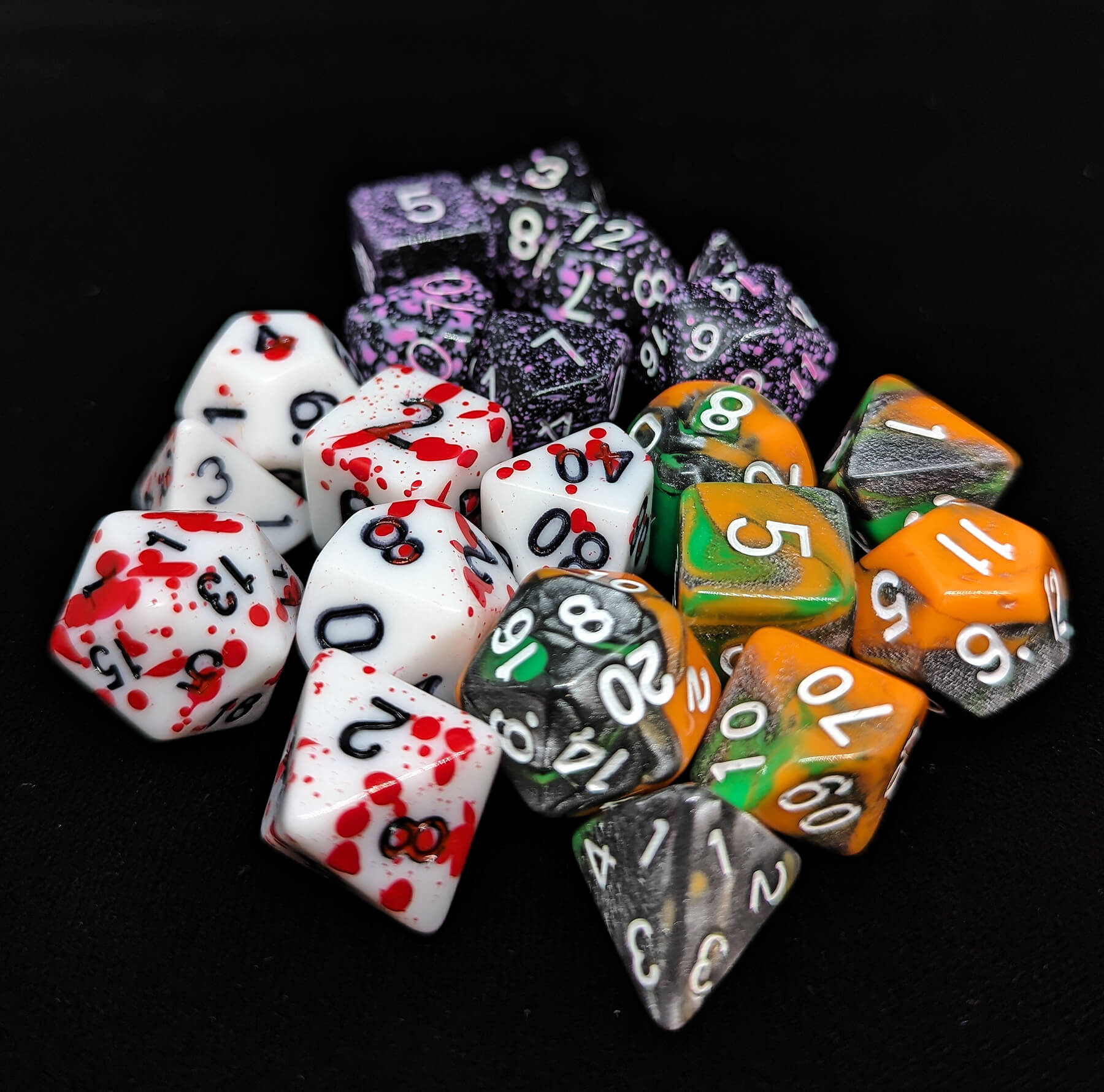 - One set of 7 mystery dice: Blood Splatter, Purple Splatter, or Witch's Brew! Includes matching d4, d6, d8, d10, d00, d12, d20.