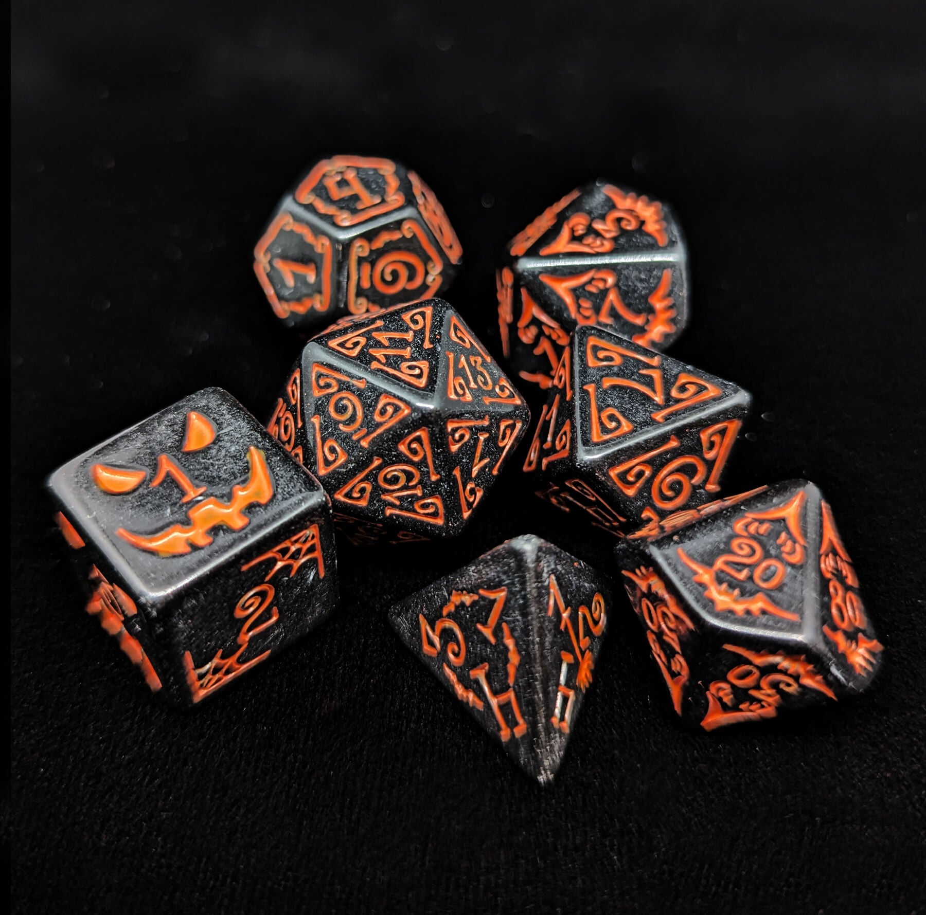 - One set of 7 special edition Halloween dice. Matching d4, d6, d8, d10, d00, d12, d20.