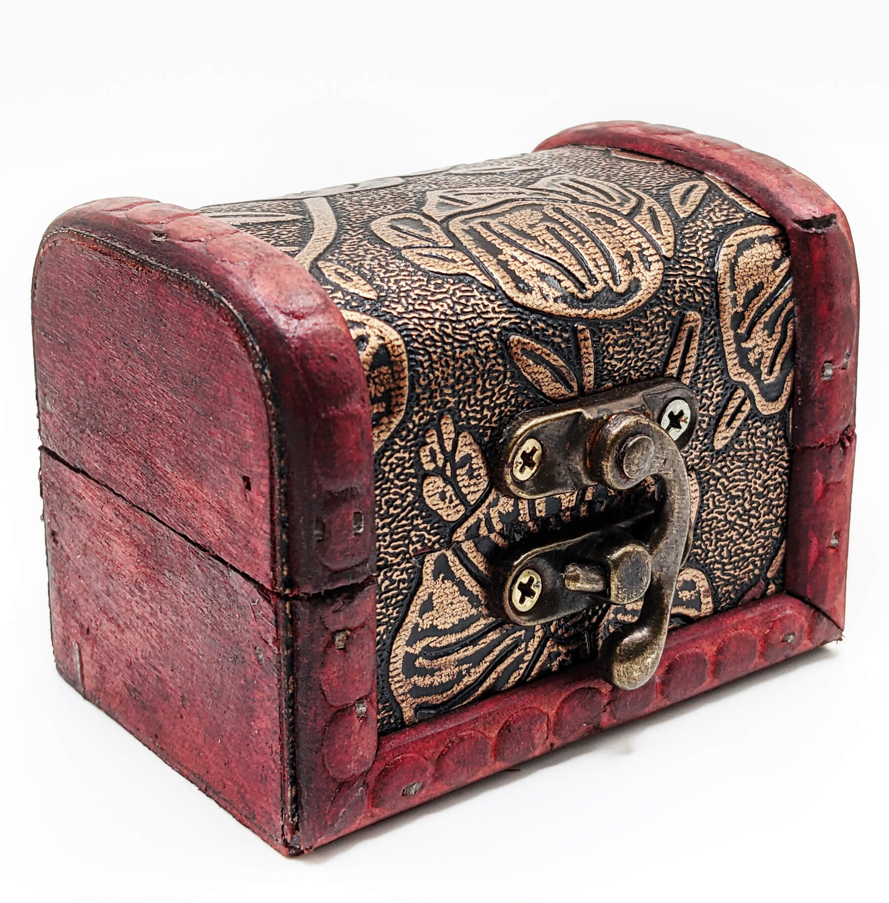 This small handcrafted dice box is a great way to store and showcase your favorite RPG dice. Dice box features a treasure chest design with secure clasp. Embossed copper colored design and reddish-brown stain.