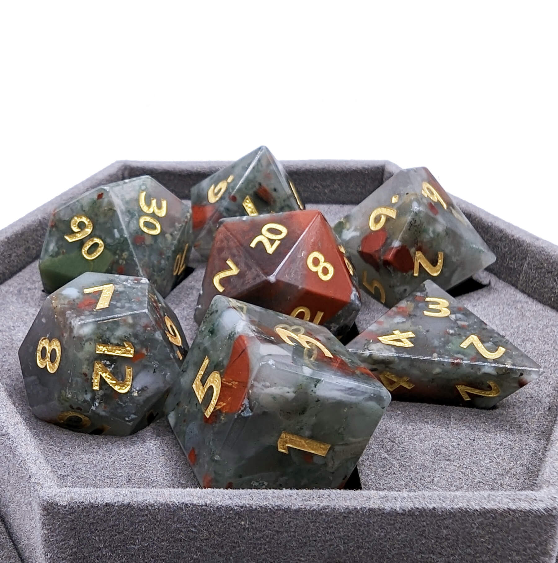 If you're looking for premium dice look no further! This 7-piece dice set is crafted from natural African Bloodstone. The dice are heavy in the hand and look stunning. Use the dice in your next RPG campaign or as an awesome conversation piece.
