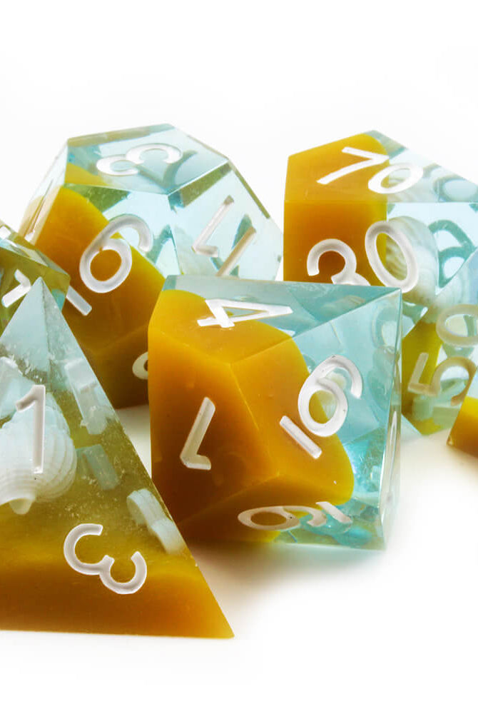 Now available at Dark Elf Dice! Seashell Dice. This beautiful collection of ocean-inspired gaming dice is just what you've been waiting for. The dice are cast in gorgeous, translucent colors and contain tiny seashells. Unique and beautiful! Seashell dice are ready for your favorite tabletop roleplaying games.