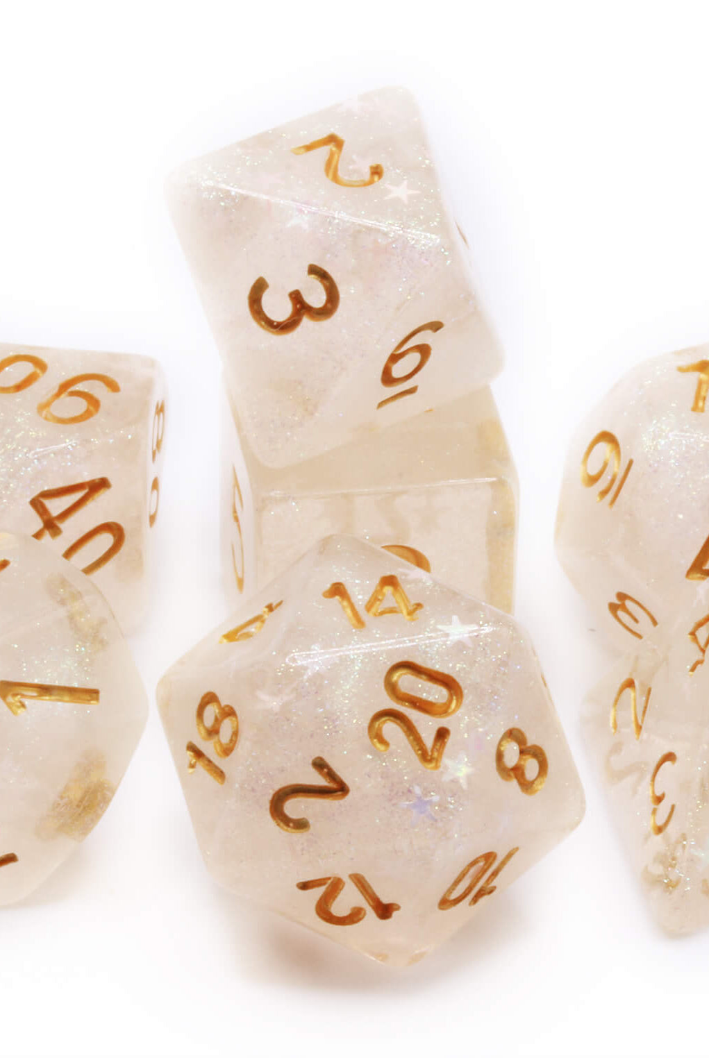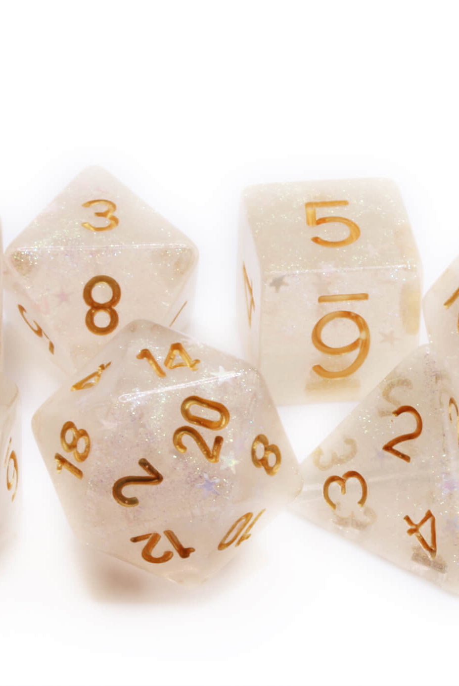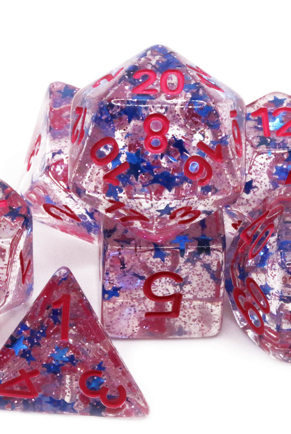 Check out the latest collection on Dark Elf Dice! Star Dice are a unique assortment of RPG dice perfect for Dungeons & Dragons, Pathfinder, and all your favorite tabletop role-playing games. Star Dice are crafted from crystal clear acrylic that's been infused with colorful, tiny stars and glitter. The end result is a gorgeous set of dice just waiting to take you on an adventure of your imagination!