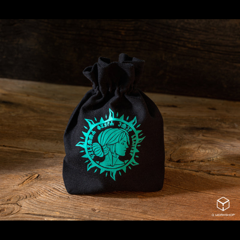 The legacy of Lara Dorren. This dice pouch, inspired by the world of The Witcher, shows the profile of Ciri's face, framed by the words "Cirilla Fiona Elen Riannon" in the runes of Nilfgaard, and the sun from the coat of arms of the empire. It is made of durable cotton in a black color, which emphasizes the light-blue print. Closed with durable strings, can hold 9 full sets of dice.