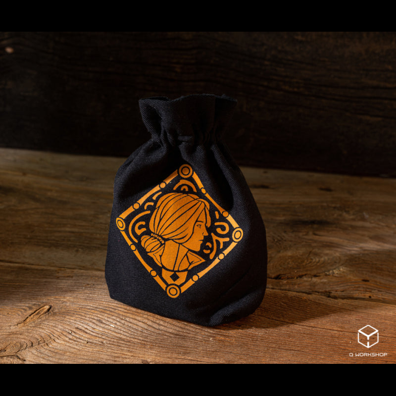 In the interest of magic. This dice pouch, inspired by the world of The Witcher, shows the side-profile of Triss Merigold, one of the founders of the Lodge of Sorceresses, framed in the depiction of her intricate medallion. It is made of durable cotton in a black color, which emphasizes the orange print. Closed with durable strings, can hold 9 full sets of dice.