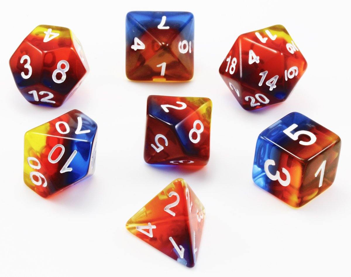 Aurora Dice (Sunrise) are absolutely breathtaking! Made from four layers of translucent color, these dice will look amazing in your collection and on the game table. Translucent layers include blue, red, smoke, and yellow.