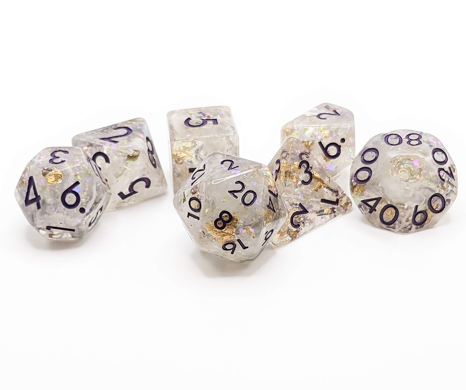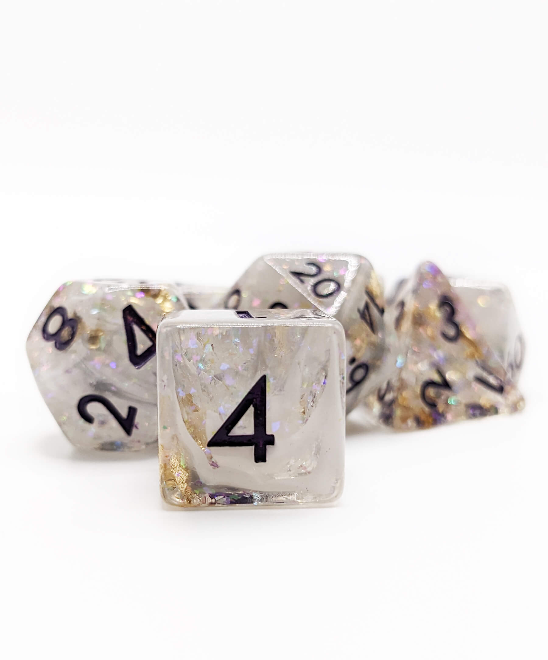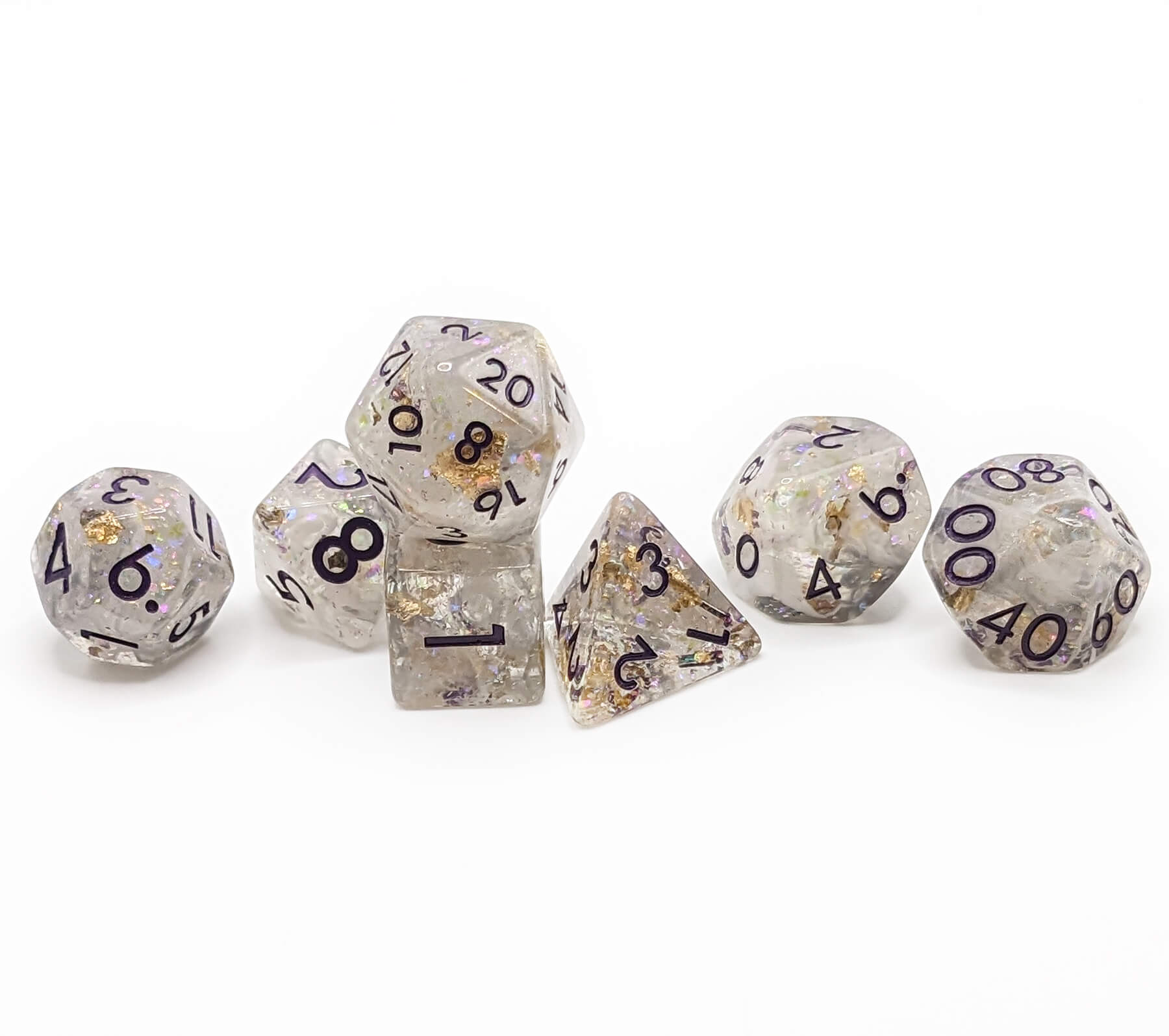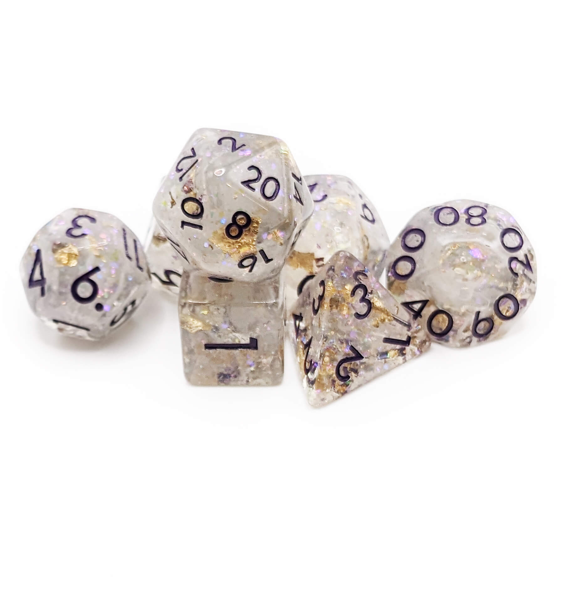 The future is now! Time to grab a set of Mecha Ghost dice and start your tabletop adventure. These stunning dice feature translucent acrylic that's been infused with cloudy white, iridescent glitter, and gold foil pieces. Whether you play scifi or fantasy games, these dice will grab your fellow players' attention and see you through the toughest of battles.